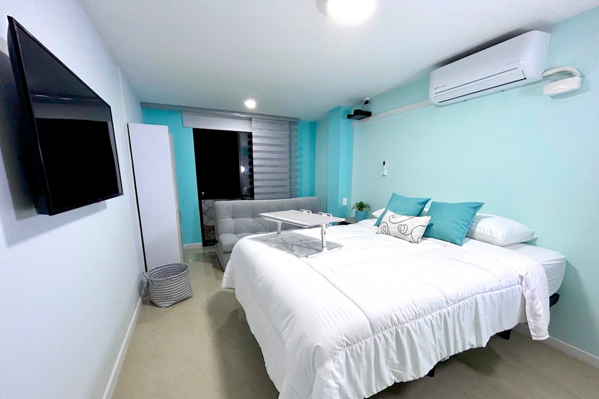 Zapraszamy do tego przestronnego penthouse'u z 2 sypialniami. Wi-Fi 100 Mb/s, telewizor Smart TV, klimatyzacja, ciepła woda i w pełni wyposażona kuchnia zapewniają komfort. Idealne dla rodzin, kadry kierowniczej i pacjentów poddawanych leczeniu. Trzy łóżka typu queen z pościelą klasy hotelowej Pralka Parking na ulicy Spacer do kawiarni, restauracji, sklepu spożywczego i parku El Ingenio; 7 min do centrum handlowego Unicentro i 10 min do centrum handlowego Jardin Plaza. 30 min do centrum miasta. Bardzo blisko uniwersytetów, Club Campestre i Clínica Valle de Lili. 60 min do lotniska.
