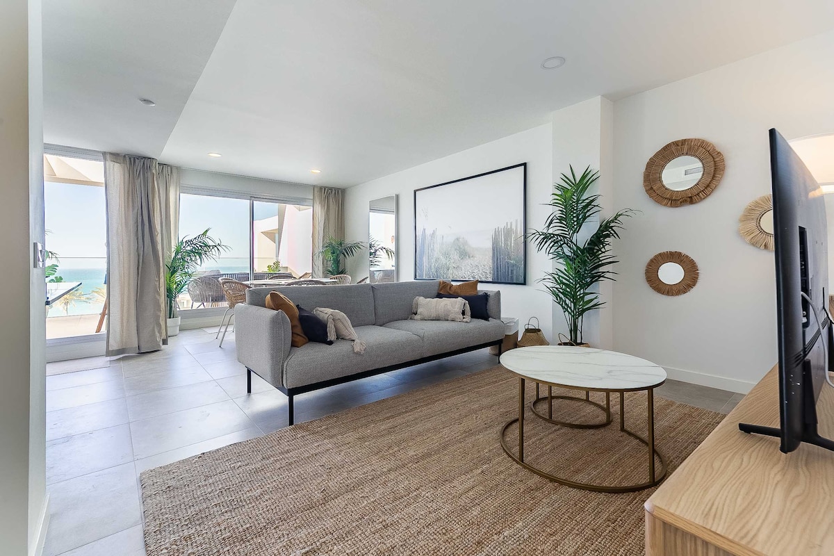 Dwupoziomowy apartament na plaży z 3 sypialniami, 2 łazienkami, prywatnym parkingiem podziemnym, bezpłatnym WiFi i basenem z widokiem na Morze Śródziemne, położony 1 km od promenady Benalmádena Costa.