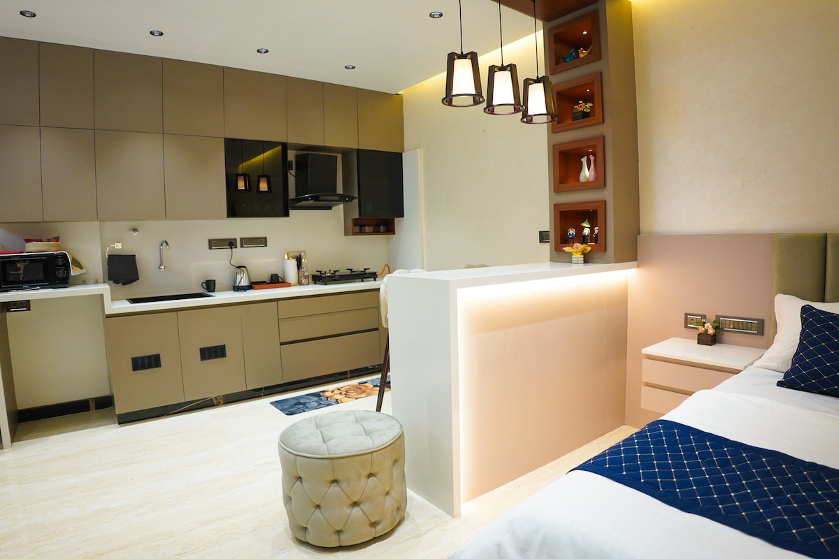 Spacious 600 square feet Designer 1BHK Suite with Private Balcony | High-Speed fibre optic Wi-Fi & Smart TV with streaming platforms, Work/Dining Desk, 24/7 power backup for uninterrupted work and comfort |Luxe King Bed & Orthopaedic Mattress ,wooden closetses for storage | fully equipped Kitchenette | Couch Bed in living room , Max.Occupancy 4 | Elevator access, professional housekeeping and access to paid laundry on site for long stays| Located in Central Bangalore | LGBTQIA++ Affirmative