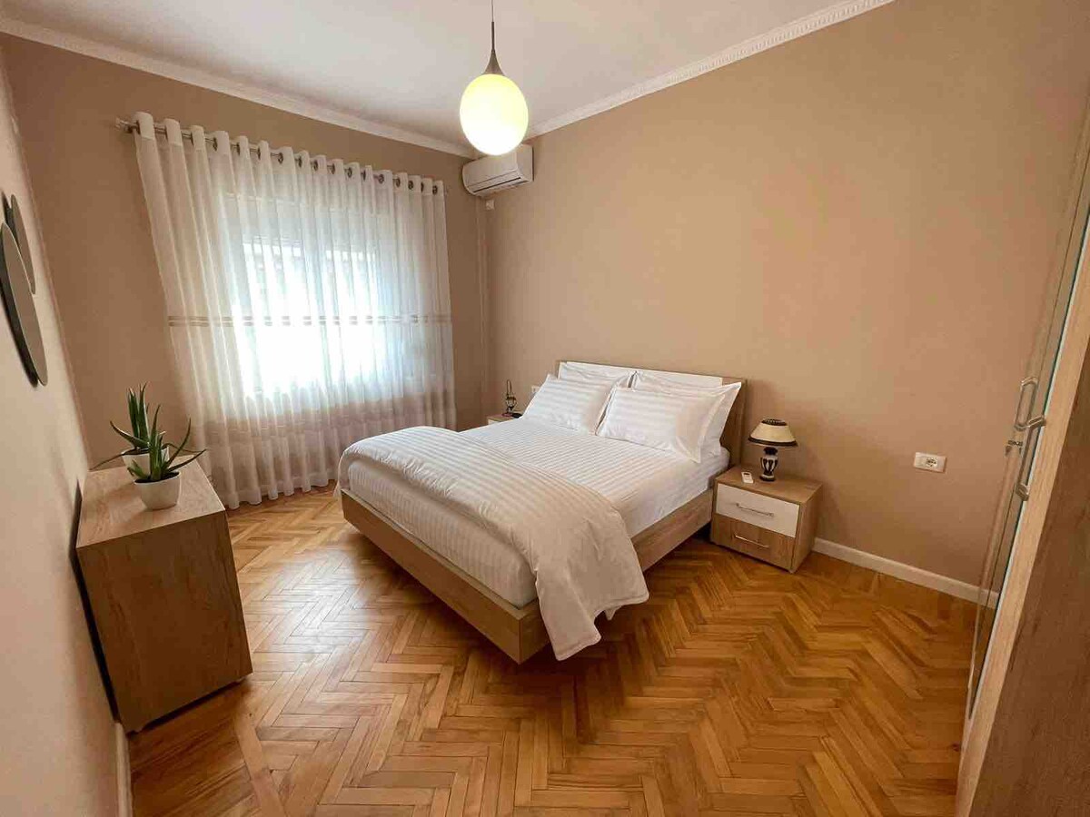 Stwórz doświadczenia i wspomnienia w naszym apartamencie położonym w Beracie, u stóp wzgórza zamkowego. Nasz apartament to przytulna przestrzeń odpowiednia dla każdego, kto chce cieszyć się zwiedzaniem 2400-letniego miasta Berat. 57 metrów kwadratowych oferuje wszystko, czego potrzebujesz, od sypialni po salon, kuchnię, łazienkę i ogród. Apartament posiada wszystkie niezbędne udogodnienia: bezpłatne Wi-Fi, kuchnię, klimatyzację, telewizor Smart TV, telewizję przemysłową, bezpłatny parking itp. Ma również bardzo piękny wystrój wnętrz, dzięki któremu poczujesz się jak w domu.