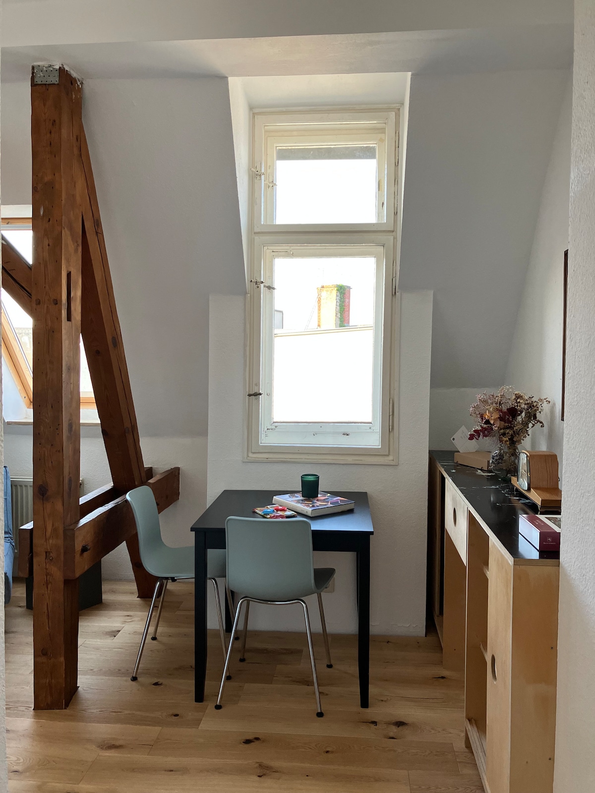 Nasz jasny apartament na dachu z 150-letnimi drewnianymi belkami znajduje się w samym sercu pięknej dzielnicy. Jest wyposażony w małą, ale stylową kuchnię i luksusową łazienkę z prysznicem z deszczownicą i sauną fińską. Oferujemy Netflix, telewizję kablową i bardzo szybki Internet. Twój pobyt u nas będzie całkowicie neutralny pod względem emisji dwutlenku węgla. Apartament może pomieścić maksymalnie trzy osoby dorosłe lub dwie osoby dorosłe z dziećmi.