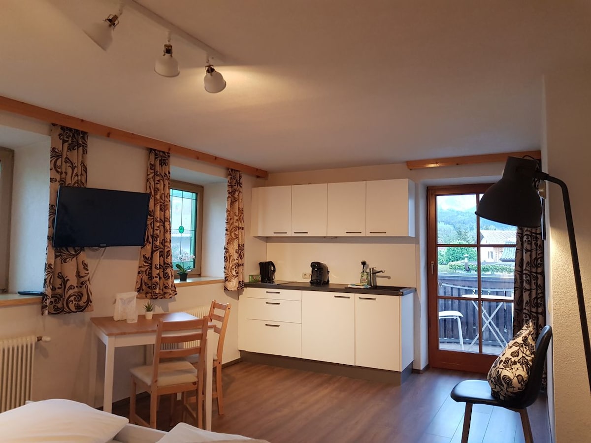 Vacation apartment Waldrausch with approx. 35m2 for 1 to 3 persons Living-bedroom with double bed (180x200) sofa bed (115x200) Kitchen with oven, fridge, coffee machine, kettle, toaster, cooking utensils and crockery Wooden corner seating area Shower room Flatscreen TV in the living room/bedroom Extension 1 room (morning dew) 2 persons possible Balcony with Zugspitze view free Wifi