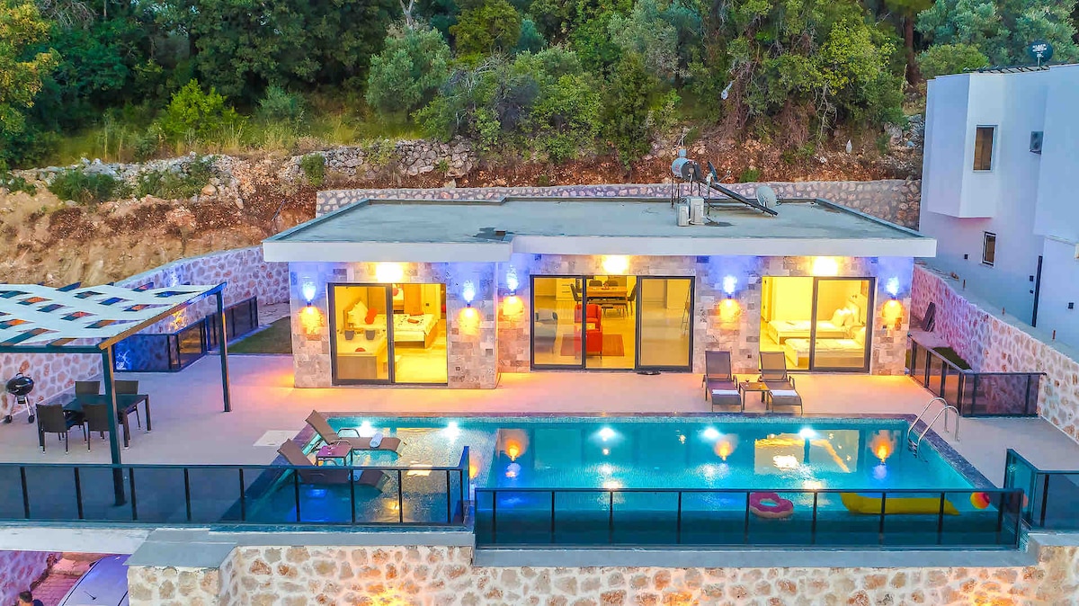Nasza kamienna willa 1+1 loft, zbudowana w całości z kamienia i ciepło urządzona z drewnianymi detalami, jest idealna dla osób poszukujących spokojnego wypoczynku w kontakcie z naturą. Kaş znajduje się zaledwie 10 minut jazdy samochodem od centrum. Oferuje ona własną przestrzeń z prywatnym basenem i osłoniętą konstrukcją. Możesz korzystać z basenu przez cały dzień, a wieczorem miło spędzić czas przy grillu. Czekają na Ciebie ciepłe, spokojne i naprawdę relaksujące wakacje.🌿