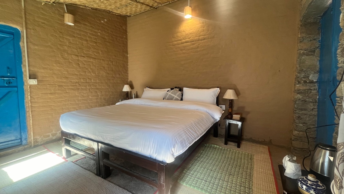 Luksusowy apartament na poddaszu to przestronne, pełne światła sanktuarium stworzone dla podróżnych poszukujących intymności i elegancji. Skośne drewniane sufity, wielowarstwowe tekstury i prywatny balkon z widokiem na dolinę zachęcają do długich poranków, powolnych wieczorów i spokojnej refleksji. Każdy szczegół – od starannie dobranego wystroju po delikatne górskie światło – tworzy kokon spokoju. Idealny dla par lub osób podróżujących samotnie, apartament łączy w sobie wyrafinowany komfort z ponadczasowym urokiem spokoju wzgórz Ramgarh.