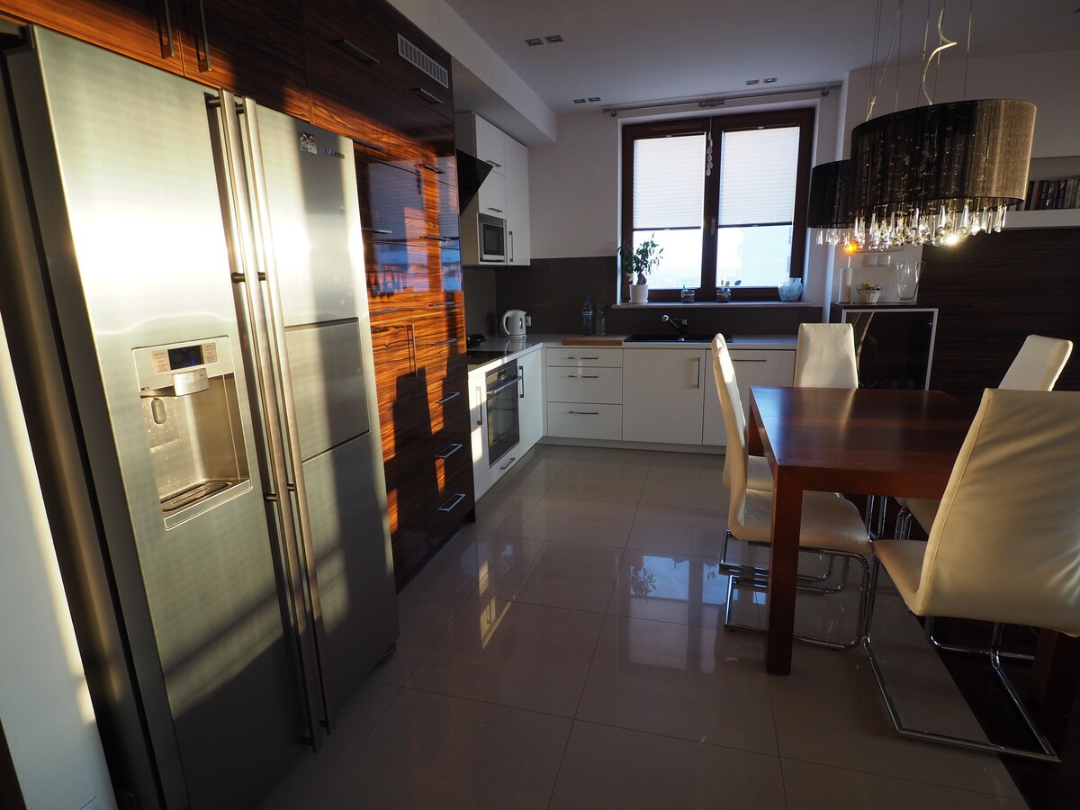 Oferujemy Państwu nowoczesny i przyjemny, 3-pokojowy apartament przygotowany do pobytu 5 osób. Apartament położony jest z brzegu miasta w nowym budynku. Dużo darmowych miejsc postojowych. Jest część wypoczynkowa z rozkładaną sofą, aneks kuchenny oraz dwie sypialnie z łóżkiem szerokości 160 cm i 140cm. Na gości czeka piękny duży i słoneczny taras. Mieszkanie ma bardzo dużo pojemnych szaf. W łazience goście znajdą pralkę oraz suszarkę. Dostęp do dużej ilości ścieżek rowerowych