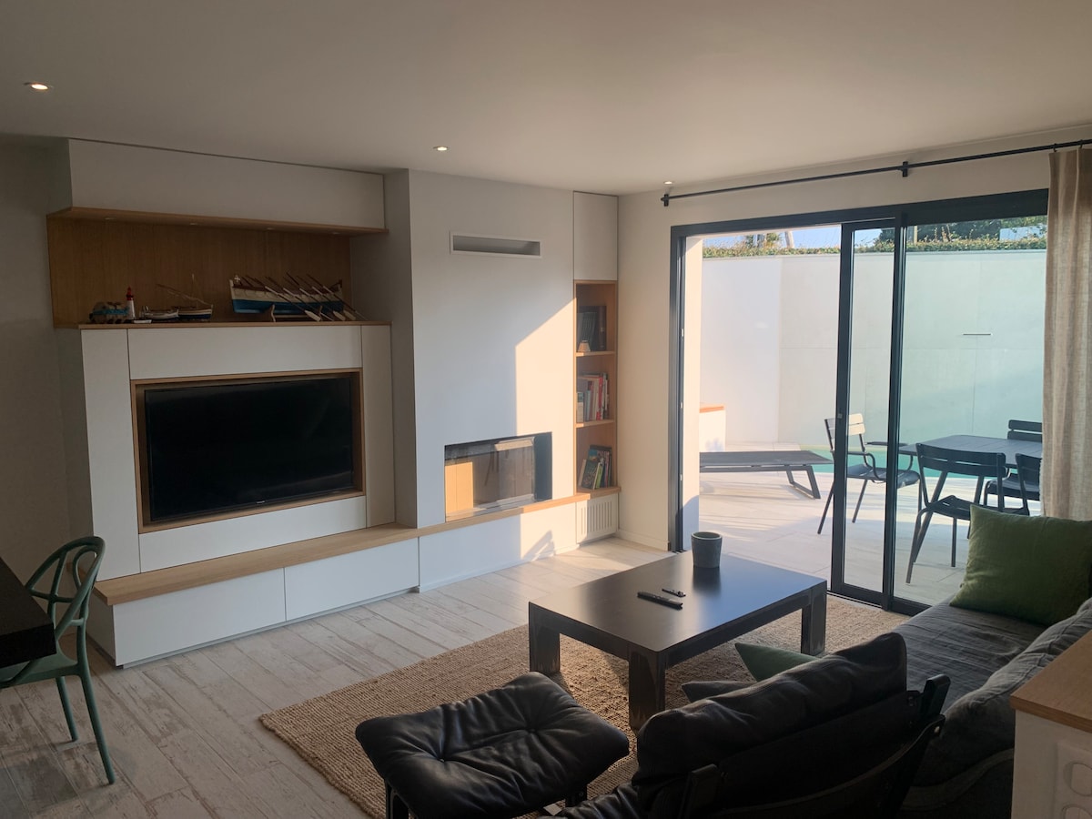Villa neuve d'architecte de 130m2 offrant de belles prestations. Extérieur : terrasse avec piscine (4x2) chauffée sans vis à vis, plancha, garage. En rez de chaussée : séjour avec TV, cheminée, cuisine américaine. Chambre (1) : lit double 160, salle d'eau (douche et wc) Wc invités A l'étage: Espace TV Chambre (2) : lit double 160 Chambre (3) : lit double 160 Salle d'eau (douche) Wc séparés Grande terrasse Climatisation réversible dans toute la maison Linge fourni