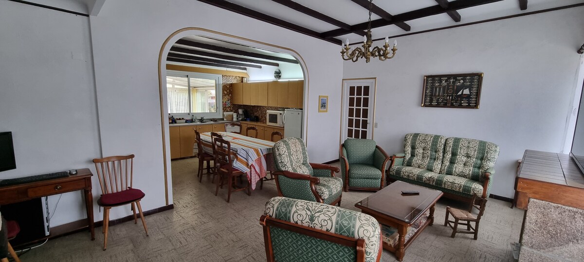 Cette maison familiale est proche de tous les sites et commodités. Vous aurez de l'espace pour toute la famille : grand séjour, chambres spacieuses, une belle terrasse pour les repas et un jardin au calme derrière la maison Vous pourrez aller chercher le pain et les croissants frais dans le bourg à pied. A moins de 10mn vous aurez accès aux plus belles plages et sites du coin...