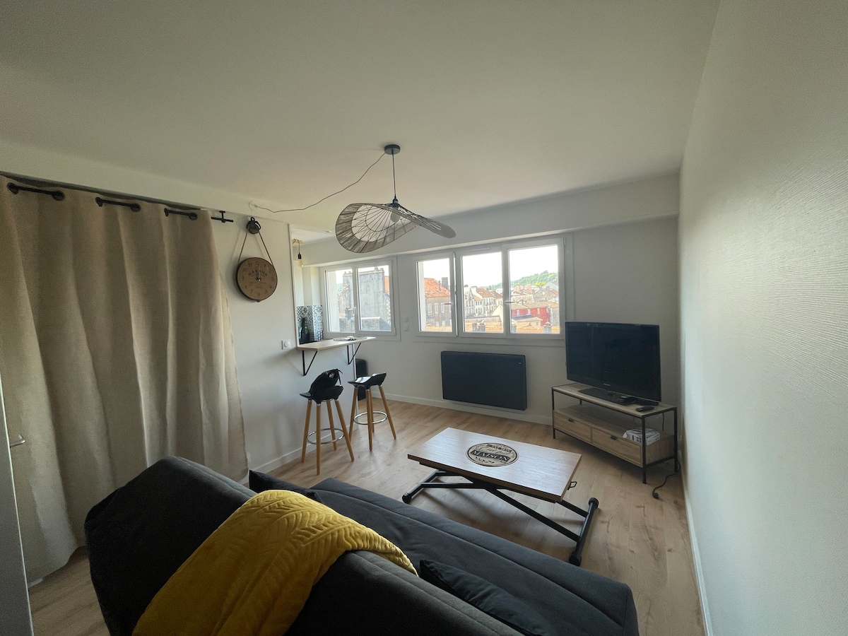 ________* WYNAJEM MIESIĘCZNY *________ Możliwość miesięcznego wynajmu ze zniżką 24% za łączną kwotę 1100 € z opłatą wliczoną w cenę, z depozytem w wysokości 250 €. Umeblowany apartament o powierzchni 43 m² położony na pierwszym piętrze bez windy w zabytkowym budynku w pobliżu Château de Pau lub 5 minut pieszo od centrum Pau, z widokiem na pieszą ulicę dla pieszych Rue Maréchal Joffre.