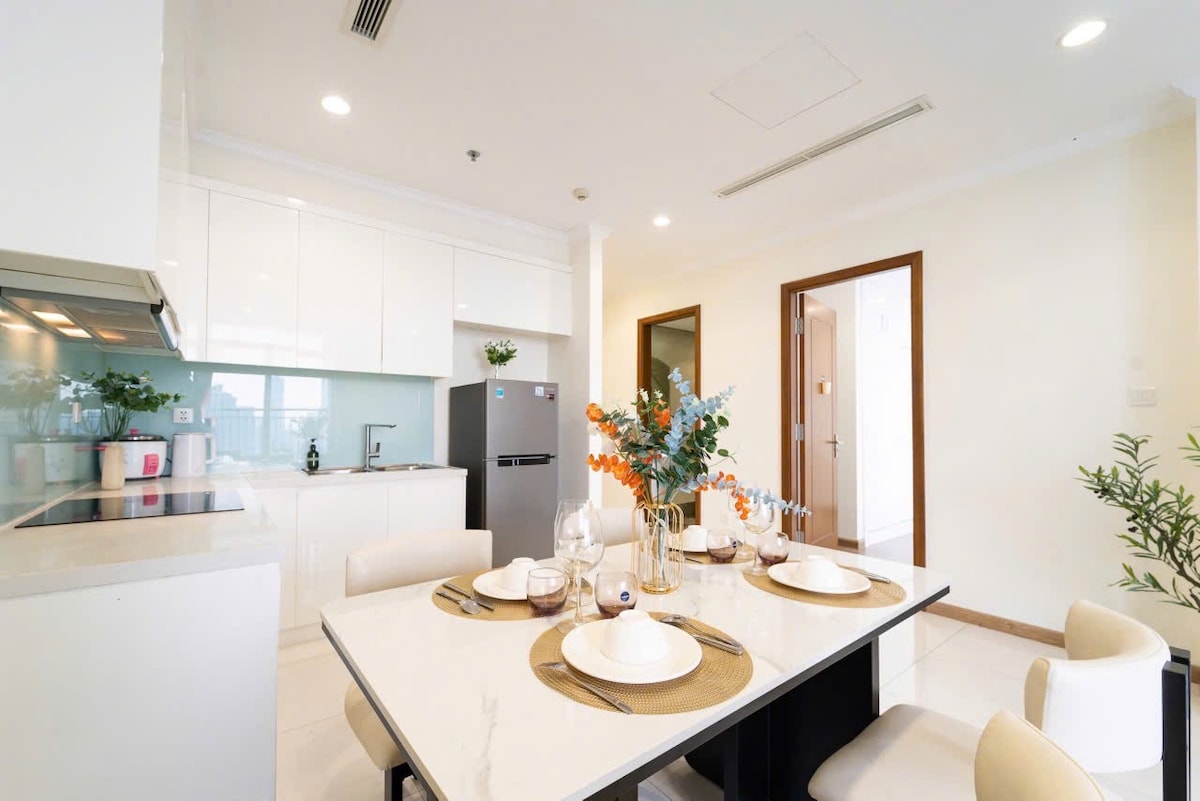 Stylishly-renovated 1-bedroom apartment on top floor of tower with a clear view of the famous Landmark 81 tower; especially beautiful at night. Fully-equipped with wide range of amenities (see photos) unmatched by other apartments in the city, fast customer service until late. Staying with us is the best choice for Guests who value reliability and convenience. Located in Vinhomes Central Park, a high-end area with restaurants, cafes, a mall, and Landmark 81. Just 10-15 minutes to city center.
