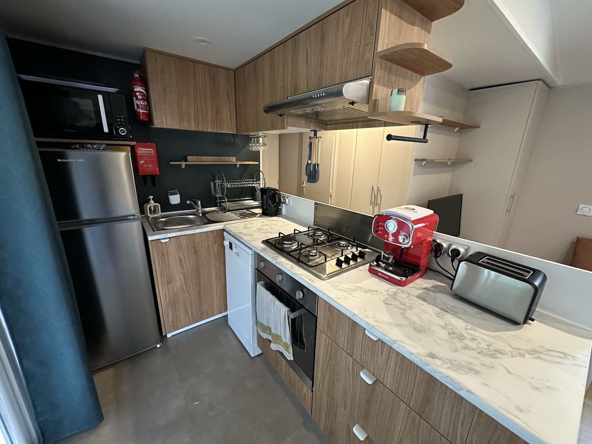 Położony na 4* dobrze zalesionym kempingu i na skraju basenu Arcachon, z rodziną lub przyjaciółmi, w tym pięknym domu mobilnym o powierzchni 32 m2 ze wszystkimi udogodnieniami niezbędnymi do udanego pobytu: dobrze wyposażona kuchnia otwarta na salon i taras o powierzchni 20 m2, dwie sypialnie, prysznic i oddzielna toaleta Prywatna plaża, tenis, wypożyczalnia rowerów. Kemping i park wodny dostępne za opłatą na stronie Siblu