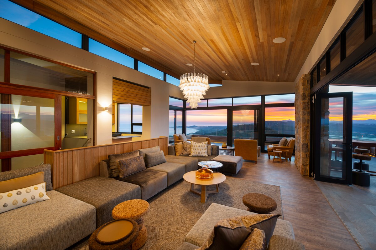 Luksusowy apartament @ Alkira Lodge: pomieści do 3 osób z kominkiem i szklanymi drzwiami połączonymi z salonem na świeżym powietrzu z widokiem na lagunę. Duża łazienka z wanną z hydromasażem dla par, prysznicem wewnętrznym i szklanymi drzwiami do prywatnego ogrodu i prysznica na zewnątrz. Oddzielna toaleta. Przestronny salon (może pomieścić trzecią osobę) otwiera się na taras z widokiem na ogród fynbos do oceanu. Śniadanie jest wliczone w cenę każdego dnia z opcją drinków o zachodzie słońca z widokiem na słońce i kolację.
