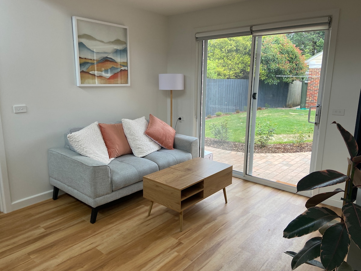 Nowo wybudowany, jednopokojowy domek w Cheltenham na tyłach domu rodzinnego. Bungalow ma własne drzwi wejściowe. Łóżko typu queen size, duża łazienka i otwarta część dzienna z w pełni wyposażoną kuchnią. 300 m do dworca kolejowego Cheltenham, sklepów i restauracji. 150 m do całodobowego parkingu. 1,5 km do centrum handlowego Southland. 2 km do plaży. Drzwi wejściowe znajdują się przy podjeździe z tyłu całej posesji, a tylne drzwi otwierają się na ogród naszego domu rodzinnego z dziećmi.