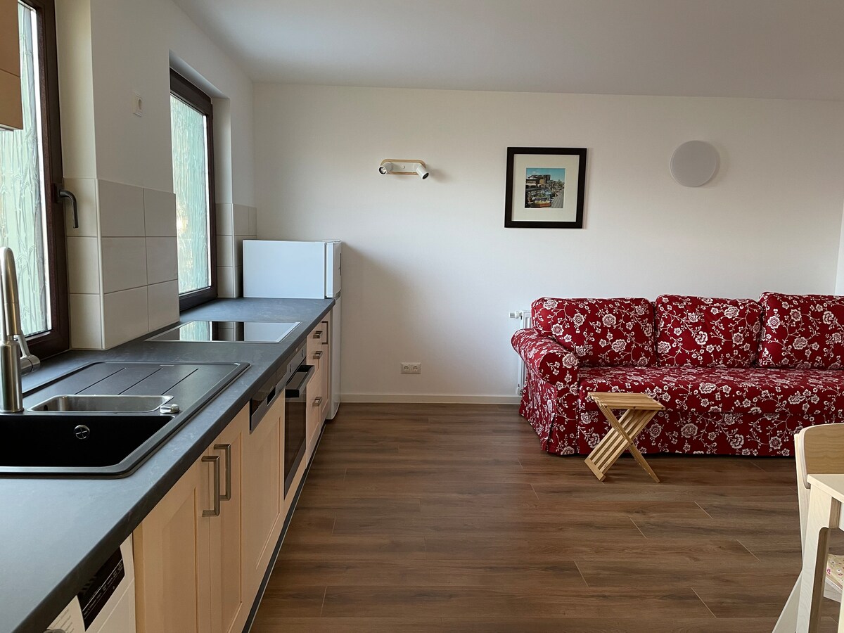 30 m² mieszkanie w odnowionym domu dwurodzinnym Wejście Pokój główny z łóżkiem 1,60 m, kanapą (z funkcją spania o szerokości 1,30 m), stół jadalny jako kredens W pełni wyposażona kuchnia (najwyższej jakości urządzenia, kawa, herbata, czekolada do picia gratis) naprzeciwko podwójna umywalka po lewej stronie wejście do otwartego prysznica z deszczownicą po prawej stronie toaleta (zamykane drzwi) el. rolety pokój główny i toaleta Plisy na wszystkich oknach Pojazd(y) można zaparkować bezpośrednio przed posesją (ślepy zaułek)! Podwórko jeszcze nieodnowione