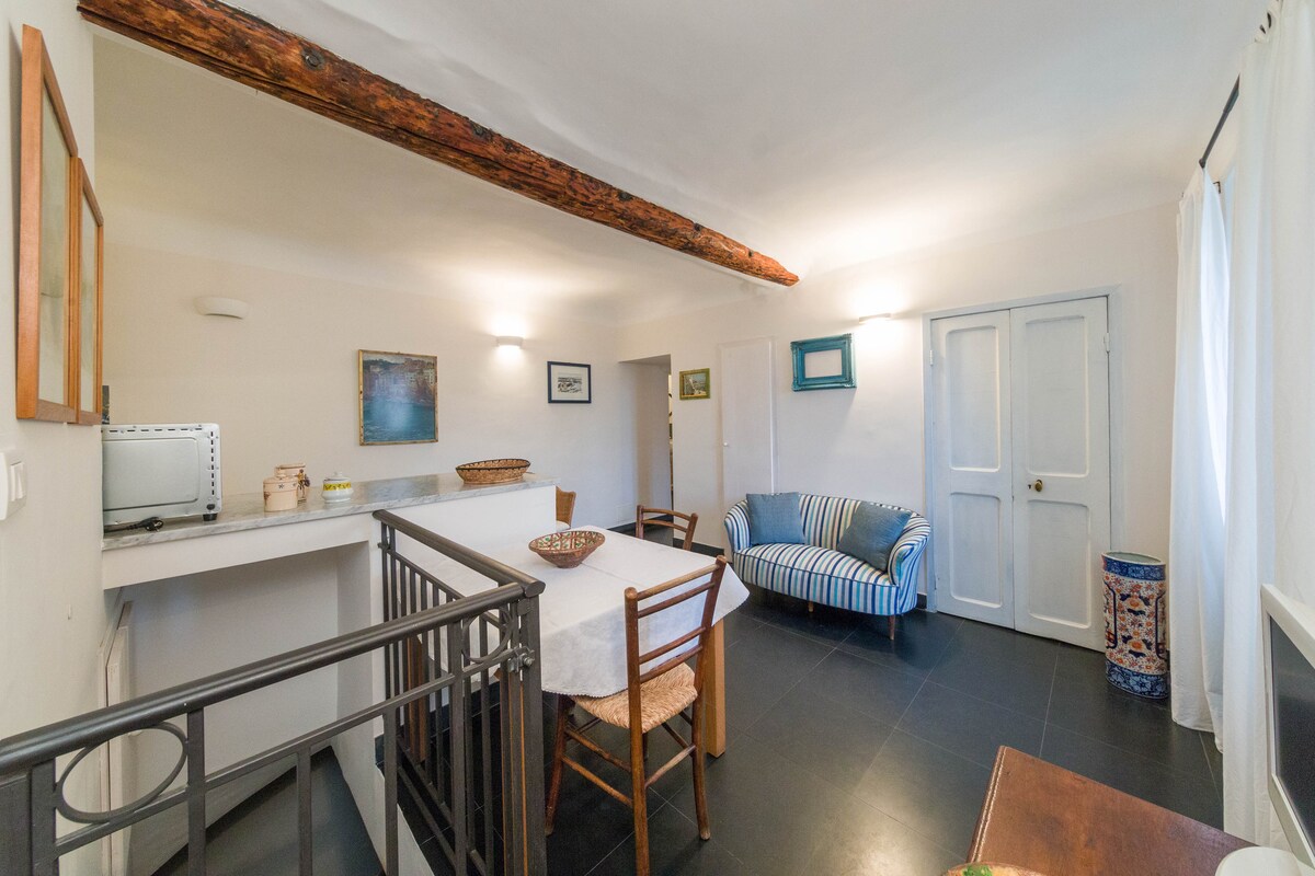 Całe mieszkanie kilka kroków od morza w jednym z najbardziej ekskluzywnych zakątków Genui. Apartament znajduje się w Capo Santachiara, pomiędzy dwiema starożytnymi wioskami rybackimi, Vernazzola i Boccadasse. Droga dojazdowa jest tylko dla pieszych. Około 80 metrów pieszo, aby dotrzeć do apartamentu z drogi dojazdowej. Znajduje się w starej rezydencji marynarskiej, odnowionej z wyrafinowaniem. Sufit ozdobiony jest drewnem z masztów starych żaglowców, a aneks kuchenny wyłożony jest starymi płytkami.