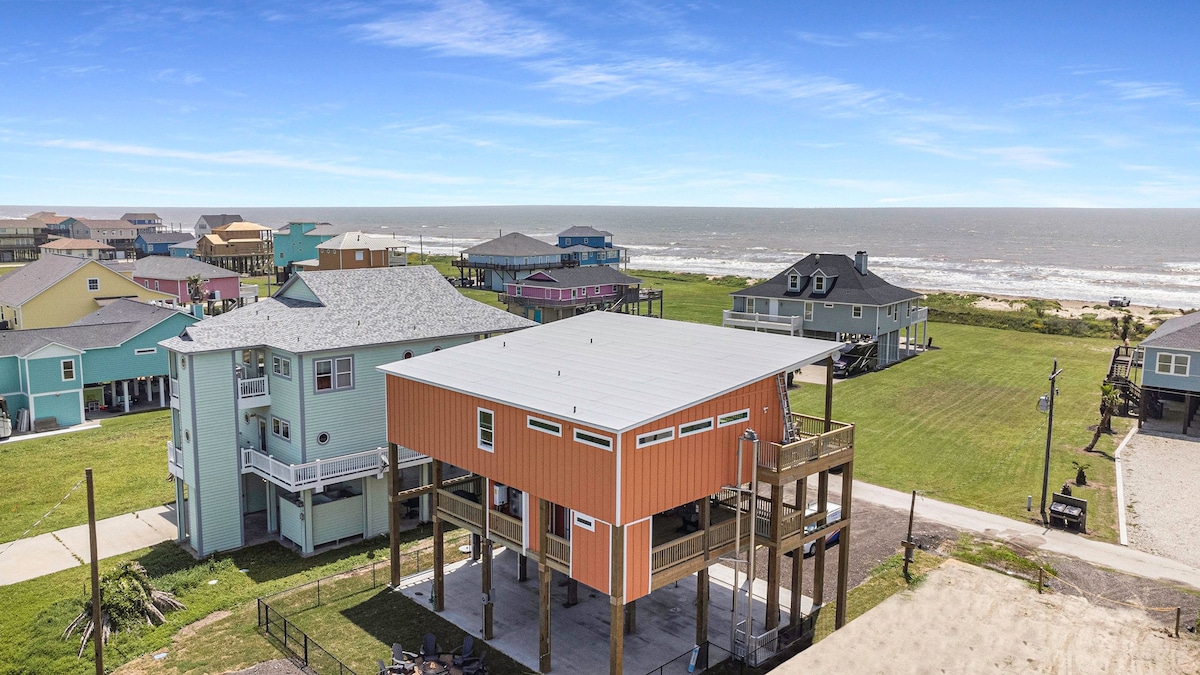 Unobstructed ocean views! See all the way down the beach to Galveston. Four bedrooms and 3 1/2 baths. Plenty of space and several decks for enjoying the sun. You have space to entertain, inside the beach home , but also underneath where you will find a large built in bar, propane/charcoal bar b q , swings, hammock loft and outdoor shower. Fenced in yard. Private walkover to the beach. Gourmet kitchen with butlers pantry. Tv's in every room. Master has soaking tub with beach view! Sleeps 14
