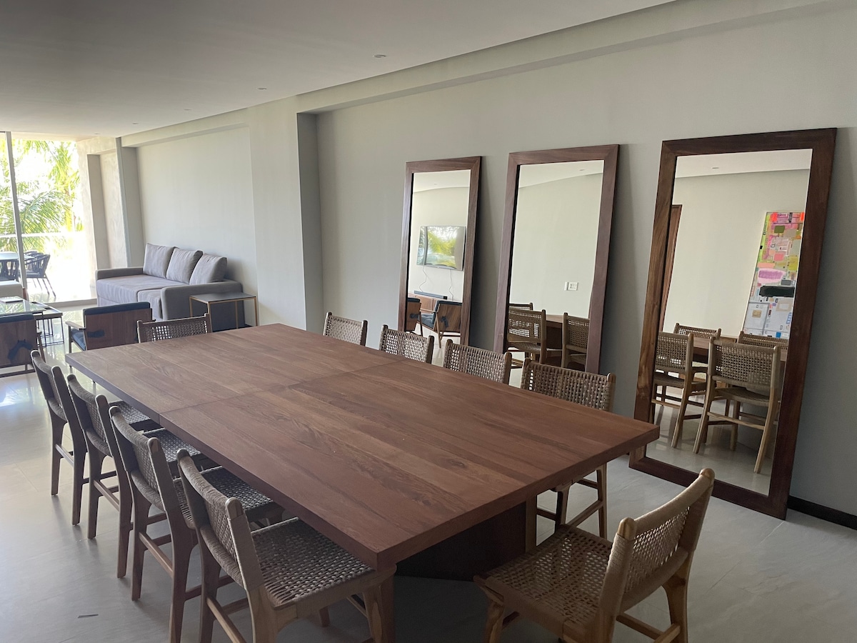 Przestronne mieszkanie dla 6 osób (w tym dzieci/niemowlęta) z pięknym widokiem na ocean. 2 sypialnie: 1 z łóżkiem typu king, 1 z łóżkiem podwójnym i pojedynczym oraz rozkładana sofa. W pełni wyposażona kuchnia i taras z widokiem na ocean/dżunglę. W Bolongo: prywatny klub plażowy, 6 basenów, spa, restauracje, bar, kawiarnia i siłownia. WAŻNE: Opłata klimatyczna w wysokości 100 MXN za osobę, płatna bezpośrednio w recepcji przy zameldowaniu, nie jest wliczona w płatność Airbnb.
