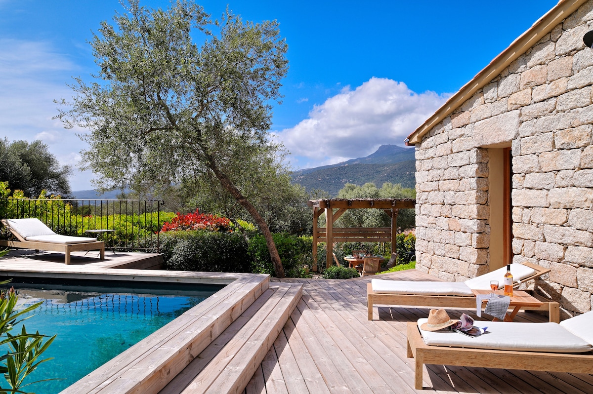 Witaj w ciszy i pięknie Alivaccii. W samym sercu tej malowniczej wioski, nasze pasterskie chatki oferują wspaniały widok na okoliczne krajobrazy. Każde miejsce zakwaterowania ma własny prywatny basen, zasilany solą i ogrzewany od kwietnia do maja, a także w październiku, zapewniając chwile relaksu i spokoju w każdej porze roku. Klimatyzacja w każdym pokoju. Ciesz się zachowaną przyrodą, która łączy w sobie wygodę, spokój i autentyczny korsykański urok.