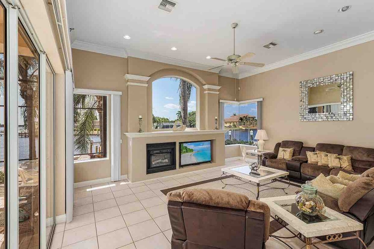 JEDNA Z NAJLEPSZYCH NADMORSKICH NIERUCHOMOŚCI W CAPE CORAL! Krótki spacer od plaży. Ten dom o powierzchni ponad 2500 stóp kwadratowych oferuje wspaniałe zachody słońca i widoki na wodę z południowego zachodu ze wszystkich głównych pomieszczeń mieszkalnych, a także z apartamentu głównego. Ogrzewany basen z kolorowym oświetleniem LED, wbudowane spa, wanna basenowa, pełna pralnia, Lanai, kominek, Wi-Fi i telewizory w każdej sypialni, prywatny dok. Łódź na windzie do wynajęcia z wypożyczalnią RPM. Duży garaż na 2 samochody z 5 rowerami, wózkiem plażowym i lodówką na miejscu.