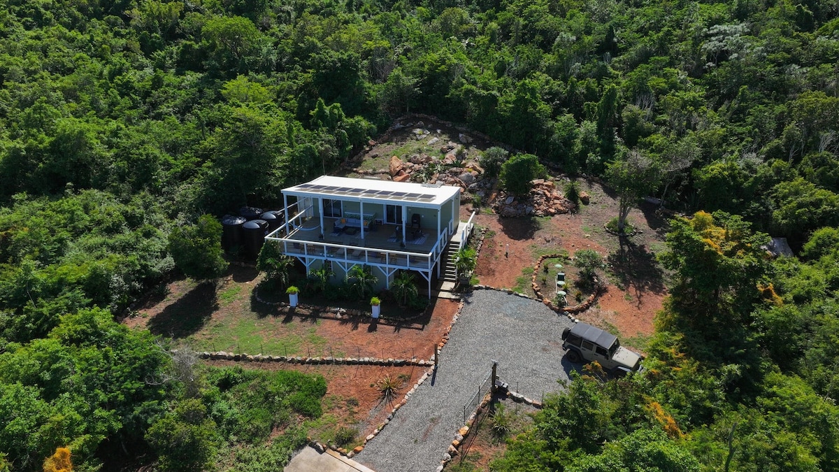 Uroczy domek z widokiem na białą wodę w zakresie 180 stopni. Możesz zobaczyć i usłyszeć uderzające fale poniżej. Klimatyzacja, prywatność, romantyzm i wspaniały prysznic na świeżym powietrzu. Zanurz się w intymności. Zanurz się w wyspiarskiej bryzie. Podziwiaj widoki wschodzącego słońca i księżyca, gdy błyszczą na krystalicznych wodach Hurricane Hole. Poczuj rytm życia na wyspie dzięki energii słonecznej i oczyszczonej wodzie deszczowej, pomysłowym rekomendacjom, radom i wskazówkom. Witaj w prostocie i elegancji.
