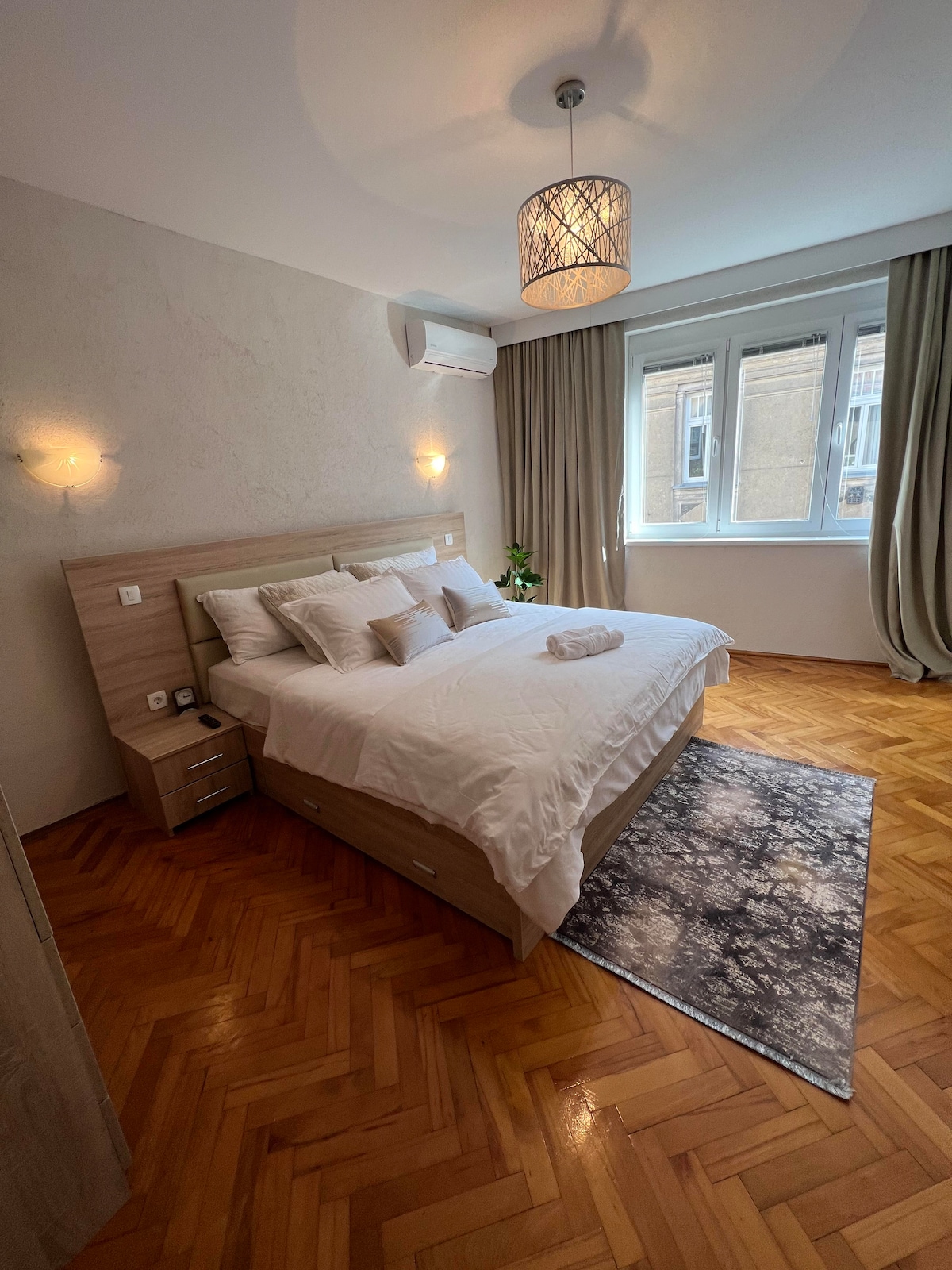 Ten wyjątkowy i przestronny, 90-metrowy apartament typu penthouse, położony jest w centrum jednej z najbardziej pożądanych dzielnic, bezpiecznej, spokojnej i oddalonej o 10 minut/800 m spacerem od serca Sarajewa. Posiada 2 sypialnie, dużą łazienkę, toaletę, nowoczesną dużą kuchnię ze wszystkimi niezbędnymi udogodnieniami, które sprawią, że Twój pobyt będzie wygodny i przyjemny. Nowo odnowiony, elegancki i ma piękny widok na miasto. W trakcie pobytu możesz korzystać z bezpłatnego Wi-Fi, telewizji, klimatyzacji, ekspresu do kawy i bezpłatnego parkingu na terenie obiektu.