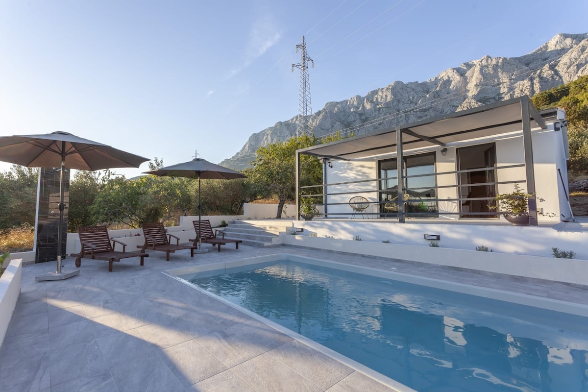 This vacation home located in Makarska is set in pure nature,surrounded with olive trees, with a beautiful view on Biokovo mountain and Adriatic sea. It's ideal for relaxing and enjoying in natural and peaceful environment. In the outer part,guests can enjoy the pool area with outdoor shower and sunbathe on deckchairs. House consists of one bedroom,living room, kitchen with dining table and bathroom and can host up to four people. The house is 15-min walk from the center and the main beach.