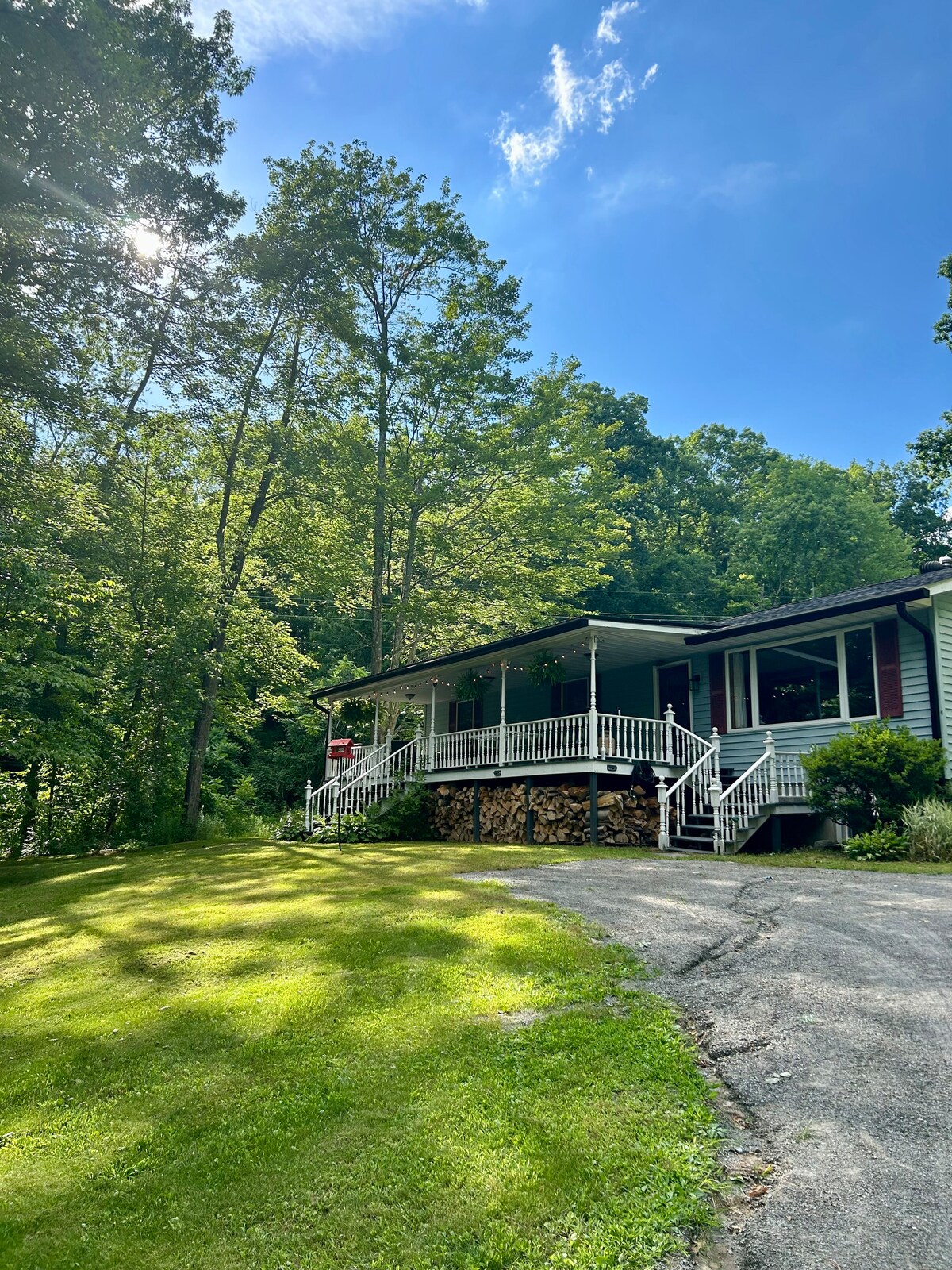 Zamieszkaj w naszym leśnym domu, który został zaprojektowany z myślą o relaksie na łonie natury. Nasz dom z trzema sypialniami, położony na zboczu wzgórza, łączy rustykalny urok z nowoczesnymi udogodnieniami. Zrelaksuj się w przytulnej części dziennej. W pełni wyposażona kuchnia zachęca do kulinarnych przygód, których można się cieszyć w pomieszczeniach lub na przestronnej zadaszonej werandzie. Udogodnienia na świeżym powietrzu obejmują palenisko do pieczenia pianek, grę w podkowy, grę w cornhole i spokojny staw, idealny do wędkowania i relaksu wśród piękna natury.