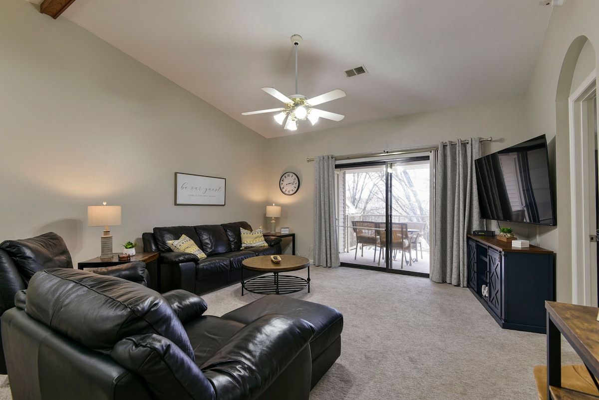 Ten niedawno odnowiony apartament znajduje się 5 minut od pasa, 15 minut od Tablerock State Park i 15 minut od Silver Dollar City. Główna sypialnia ma łóżko typu king size i łazienkę, druga sypialnia ma łóżko typu queen size i drzwi do głównej łazienki, w salonie znajduje się również sofa do spania. Jesteśmy naprzeciwko klubu, gdzie można pływać w krytym lub odkrytym basenie, korzystać z wanny z hydromasażem lub sauny i poćwiczyć na dostępnych maszynach. Dopuszczamy maksymalnie dwa psy o wadze poniżej 30 funtów.