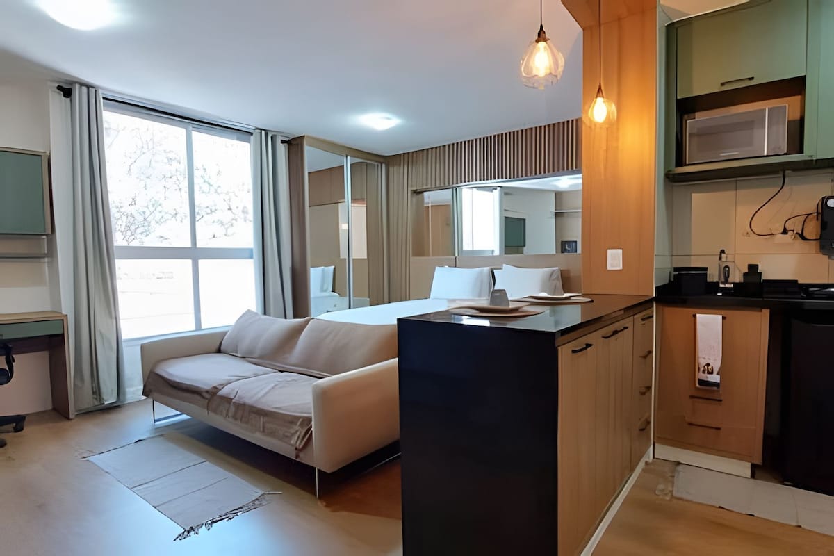 🏡 Studio na parterze – 16 m² na południowym zachodzie (Brasília) Kompaktowe, nowoczesne i funkcjonalne. 10 minut od Esplanady i lotniska, obok Sugarloaf. ✨ Klimatyzacja inwerterowa, kuchenka mikrofalowa, frytkownica, ekspres do kawy, żelazko, opiekacz do kanapek, suszarka do włosów, minibar 120 l i pojedyncze łóżko. 🛏️ Pościel, ręczniki i Wi-Fi 500 Mb w cenie. Wszystko dla Twojego najlepszego pobytu!