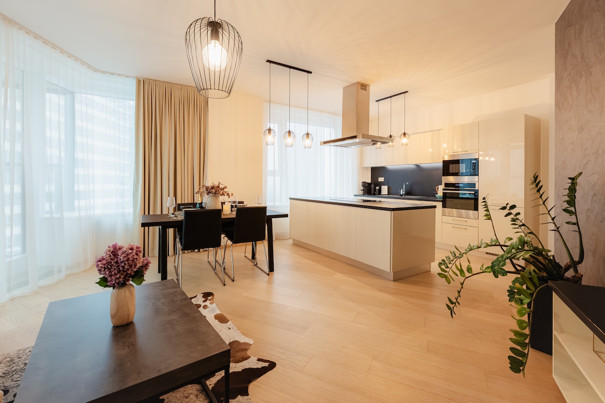 Witamy w pięknym Sky Nest, położonym na 22 piętrze – Twoim luksusowym mieszkaniu w wieży Eurovea! Ten w pełni umeblowany apartament z 1 sypialnią jest najwyższym i najbardziej prestiżowym budynkiem na Słowacji i każdego wieczoru oferuje oszałamiające zachody słońca (bezpłatnie). Znajdujesz się w samym sercu Bratysławy, z bezpośrednim dostępem do centrum handlowego Eurovea, co oznacza, że zakupy, jedzenie i spacery nad rzeką są w zasadzie Twoim nowym korytarzem. Masz ochotę na randkę? Leniwy brunch? Zakupy spożywcze w kapciach? Masz ochronę.