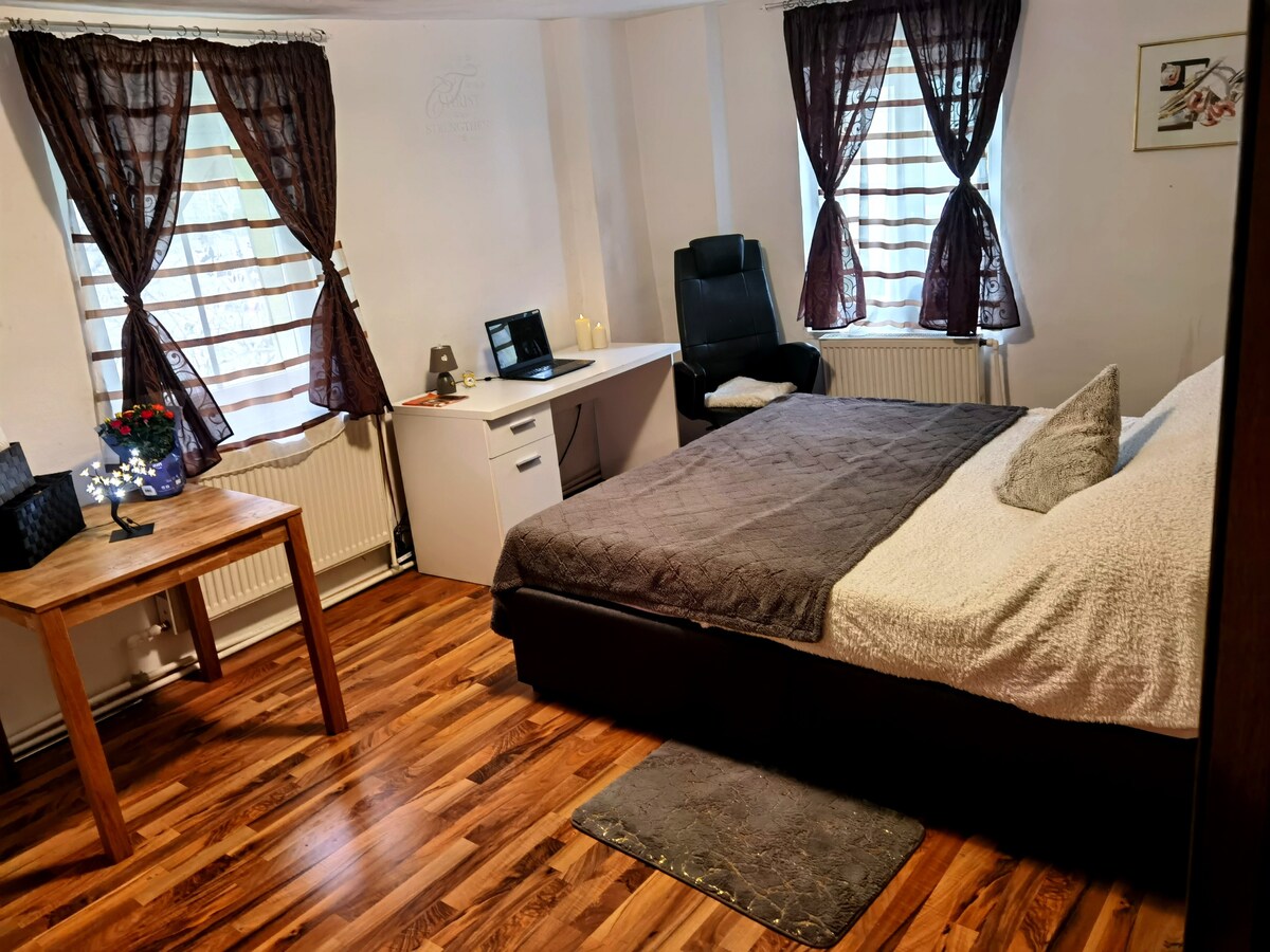 Przestronne i ciche zakwaterowanie. Meble są już starsze, ale dobrze wyposażone. Dwoje dzieci w wieku do 14 lat może spać na rozkładanej sofie w kuchni. Kuchnia to pomieszczenie przejściowe do sąsiedniej sypialni dwuosobowej. Łazienka z toaletą i pralką znajduje się na korytarzu. Sklep spożywczy, kawiarnia i całodobowy sklep są bardzo blisko. Wi-Fi w całym domu i dodatkowy kabel przy biurku dla stabilnego dostępu do internetu, np. do pracy zdalnej.