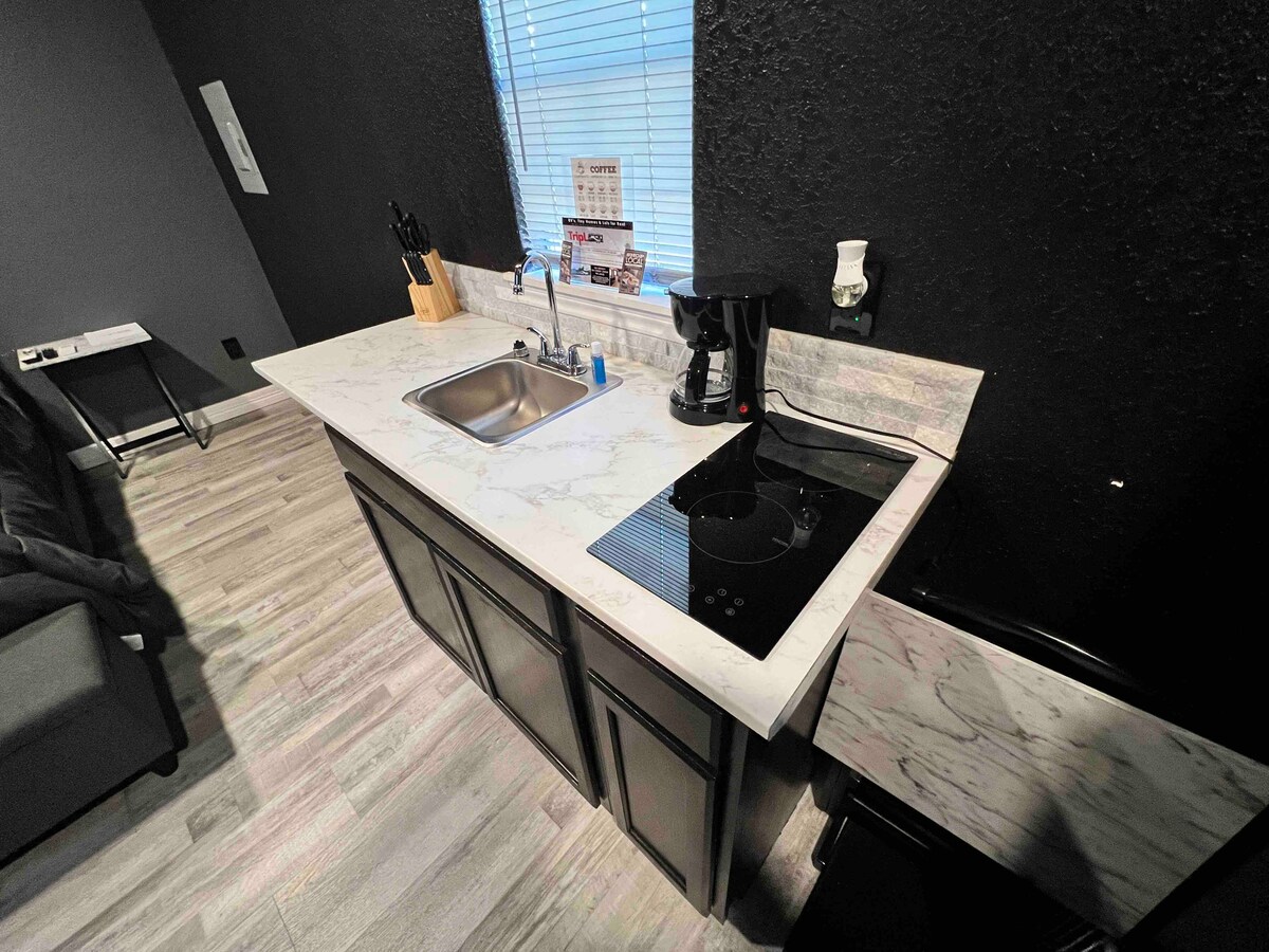 Take it easy at this unique and tranquil getaway. This dark themed cabin with custom finishes, luxury stone fireplace and shower gives way to a relaxing environment you'll be sure to enjoy.