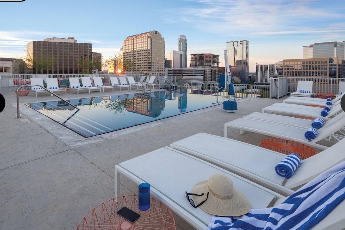 Poznaj życie w centrum miasta w Club Austin w tętniącym życiem Austin w Teksasie! Ten nowoczesny ośrodek wypoczynkowy oferuje stylowe apartamenty, basen na dachu oraz łatwy dostęp do miejsc z muzyką na żywo, restauracji i lokali nocnych. Odkryj pobliskie atrakcje, takie jak Sixth Street, lub zrelaksuj się, podziwiając panoramę miasta. Idealne miejsce na przyjemny i wygodny wypoczynek w mieście!