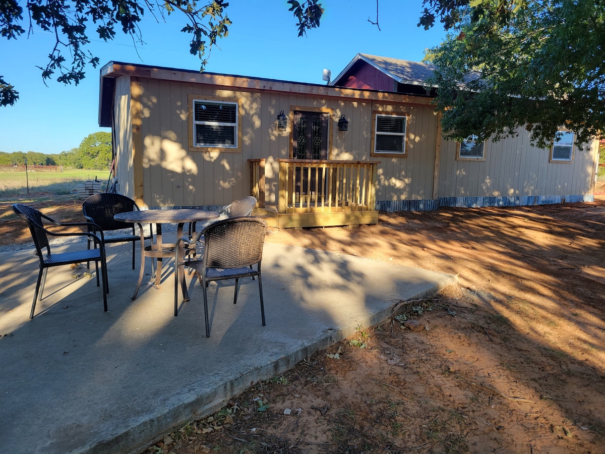 Wypoczynek na wsi na wspaniałym 100-akrowym ranczu z końmi i bydłem. Przytulny, prywatny domek o powierzchni 400 stóp kwadratowych z dala od głównej drogi. Pełna kuchnia, DirecTV, weranda, piękne widoki. Jelenie, gwiaździste nocne niebo, 200-letnie dęby, cisza, z wyjątkiem dźwięków dzikiej przyrody, płynące strumienie. Duży staw. Weź ze sobą sprzęt wędkarski, aby złapać i wypuścić dużego okonia. Pastwiska z bydłem, osłami, końmi. Przyjazne koty i psy ranczerskie. Samodzielne zameldowanie. Łatwy dostęp 40 minut do Fort Worth między Decatur i Weatherford.