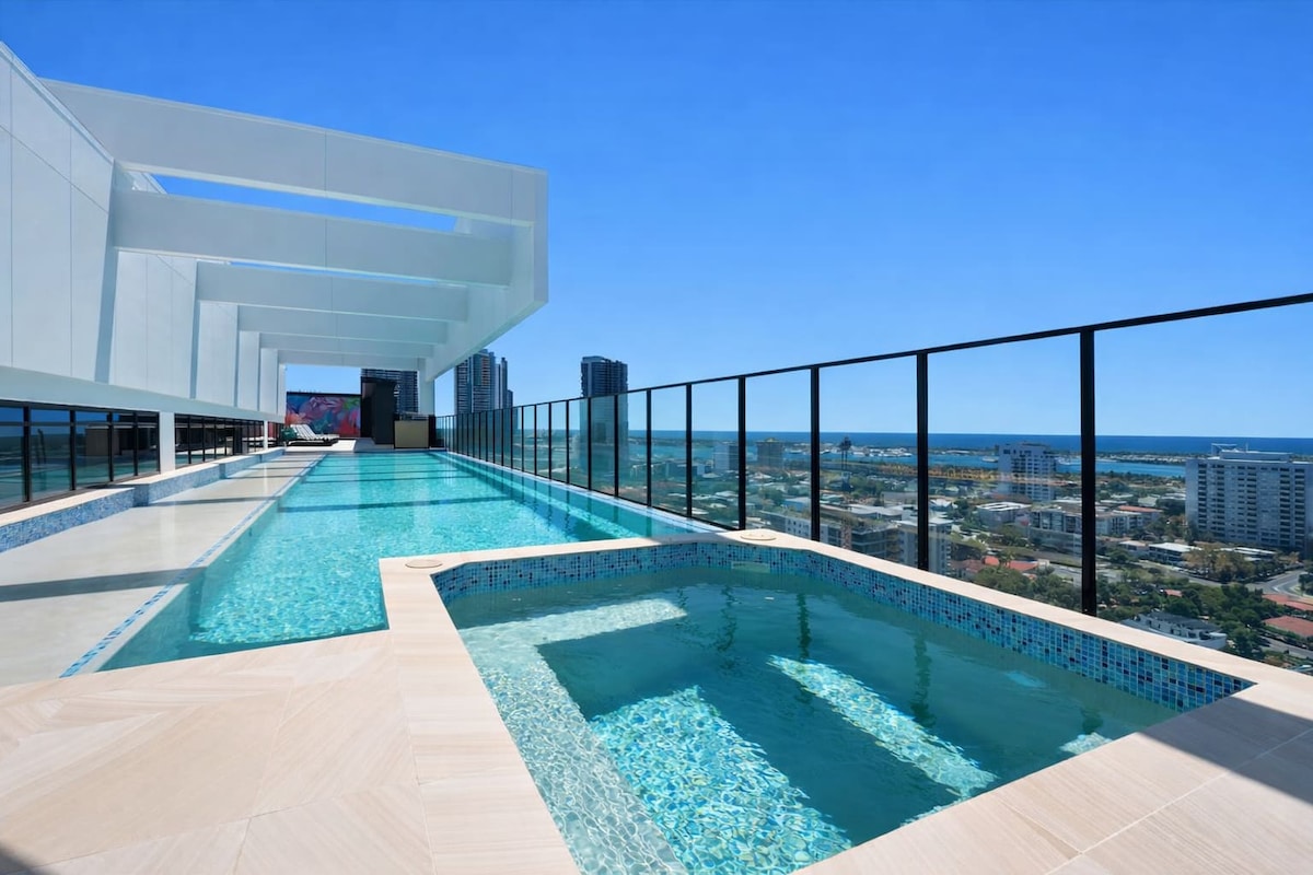 Experience luxury on the 27th floor with breathtaking, uninterrupted Broadwater views. This modern 2-bed, 2-bath Southport apartment comfortably fits 4 guests. Enjoy floor-to-ceiling windows, a private balcony, fast WiFi, dedicated workspace, bathtub, BBQ grill, central a/c, self-checkin and full access to resort-style facilities including pools, a spa, and a gym. Perfectly located with a tram stop at your doorstep, it's the ultimate Gold Coast escape.