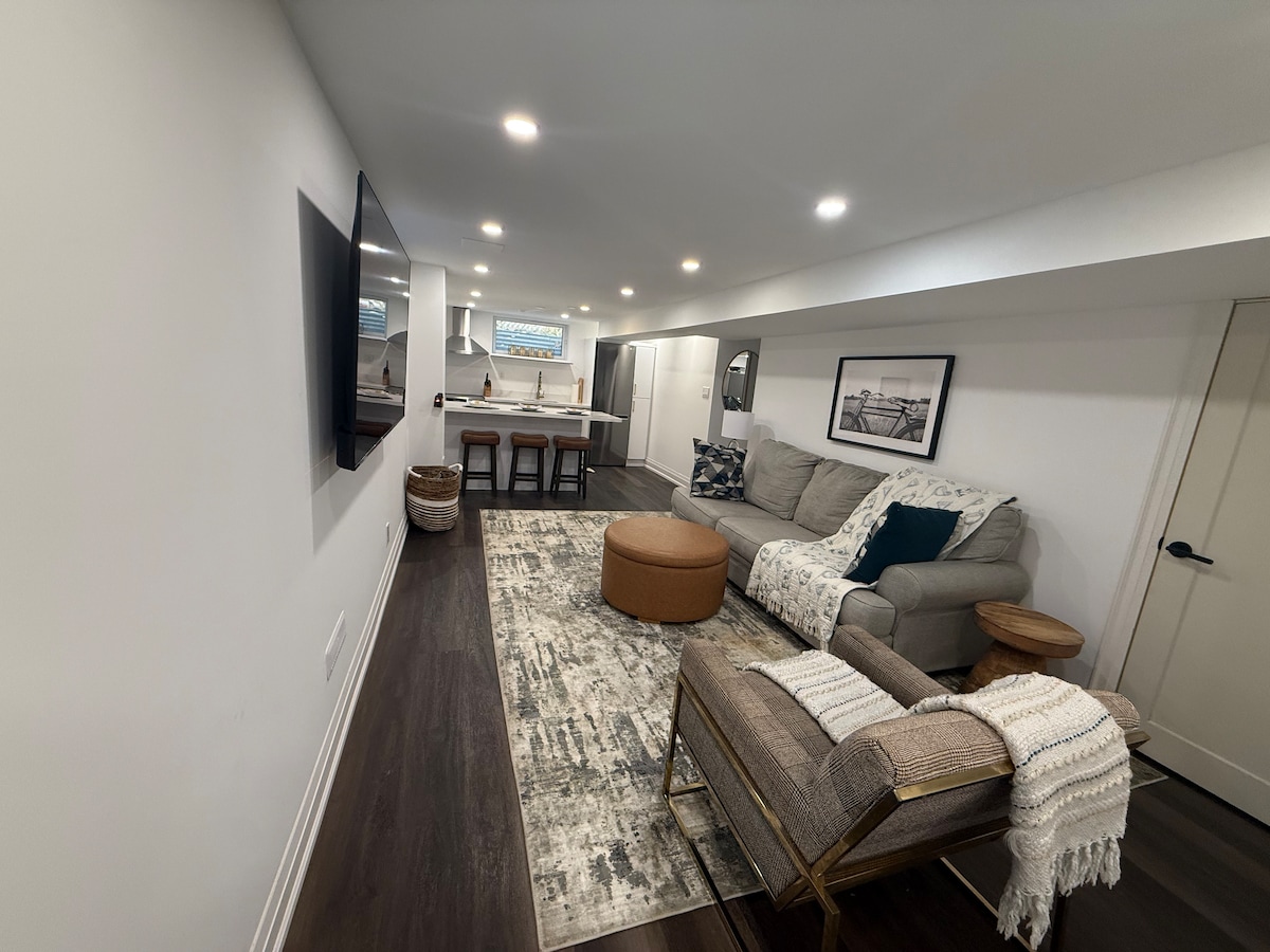 Witamy w naszym przytulnym mieszkaniu w piwnicy! To nowoczesne Airbnb znajduje się w spokojnej dzielnicy mieszkaniowej, 40 minut jazdy od centrum Toronto i godzinę od wodospadu Niagara. Dobrze oświetlona przestrzeń oferuje wygodne łóżko typu queen-size, dużo miejsca do przechowywania w przestronnej szafie i pięknie zaprojektowane wnętrze z naturalnym światłem wpadającym przez duże okna. Uwaga: mamy 2 pojedyncze składane materace do umieszczenia na podłodze w salonie. Dodatkowa pościel i poduszki są zapewnione.