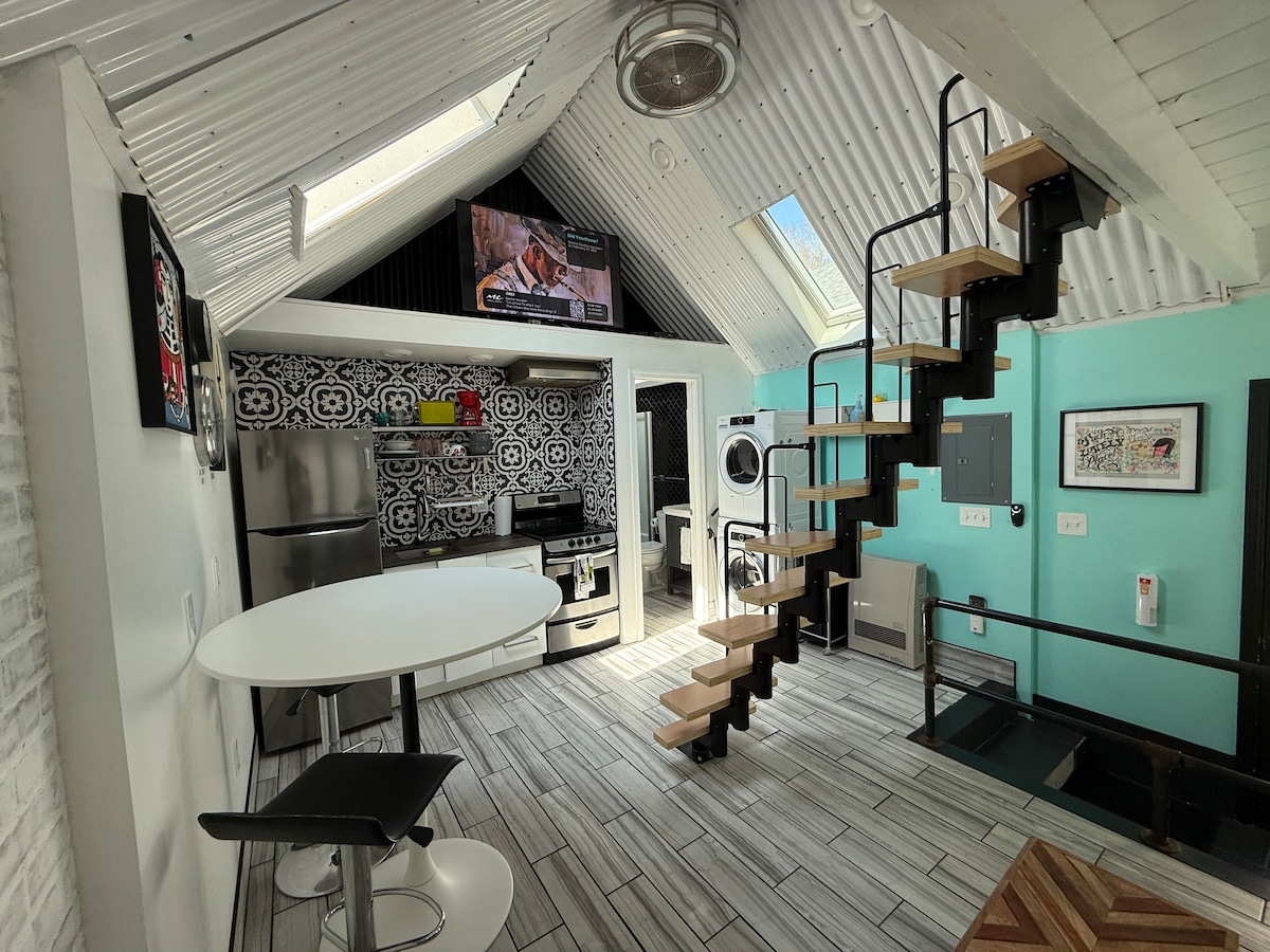 Bardzo czyste studio w centrum miasta z uroczym loftem, nowoczesne, przytulne i wygodne, wypoczynek/praca z domu. Prywatne podwórko z jacuzzi. Przy Maine St. prívate podwórko i parking. Kilka przecznic od Bowdoin i wiele więcej! Centralnie położony MidCoast/Casco Bay Area. Nowoczesny i industrialny otwarty z loftem i pełnym wyposażeniem, Wi-Fi, kablówka, pralnia, kuchnia, DVD.