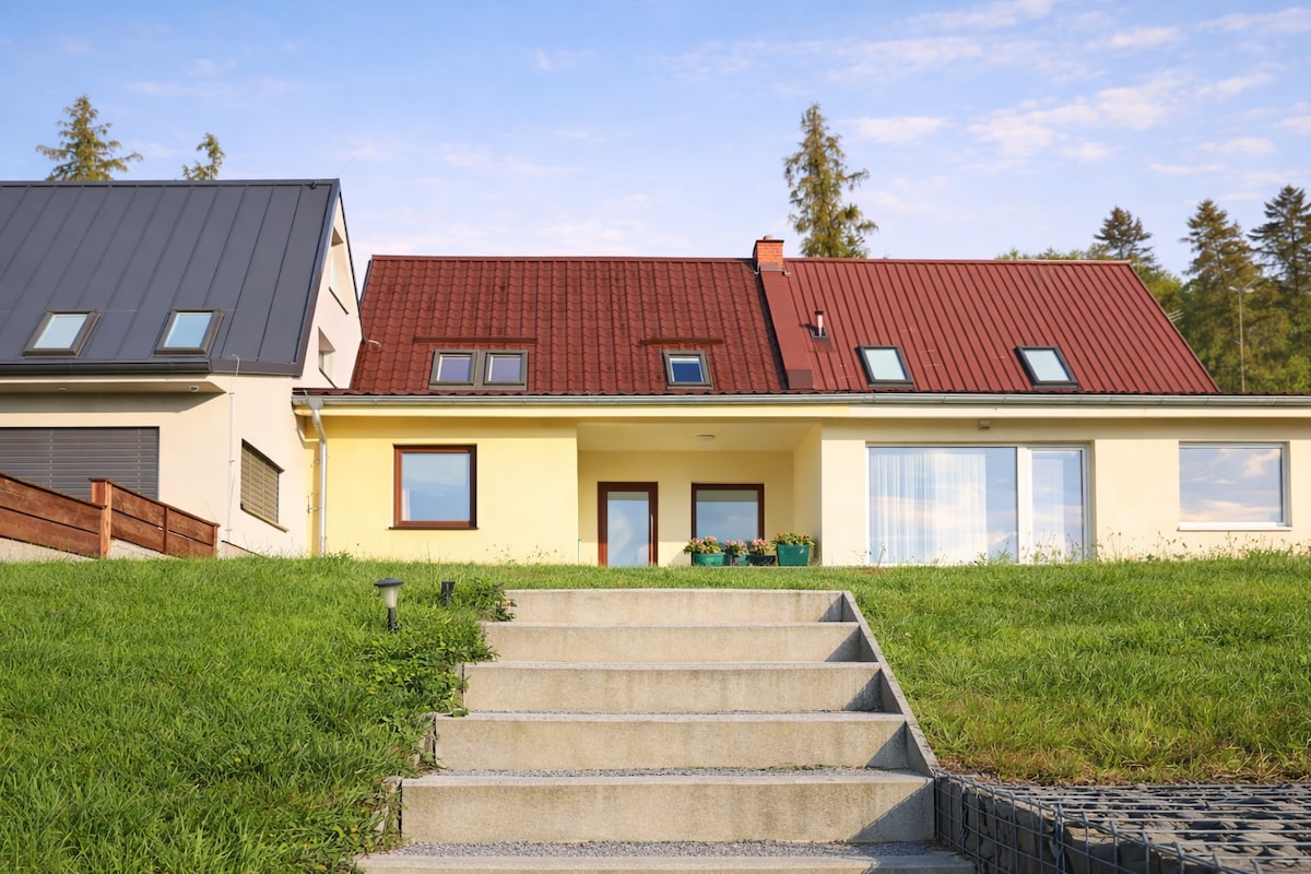 Witaj w oazie spokoju i relaksu. Oferujemy wynajem w pełni wyposażonych nowoczesnych domków w Roudně niedaleko Slezskiej Harty. Obiekt jest idealny dla rodzin, par i grup przyjaciół – może pomieścić do 8 osób, dwie sypialnie + poddasze. Piękne, spokojne miejsce, w odległości około 500–800 m od wody, widok na Praděd.