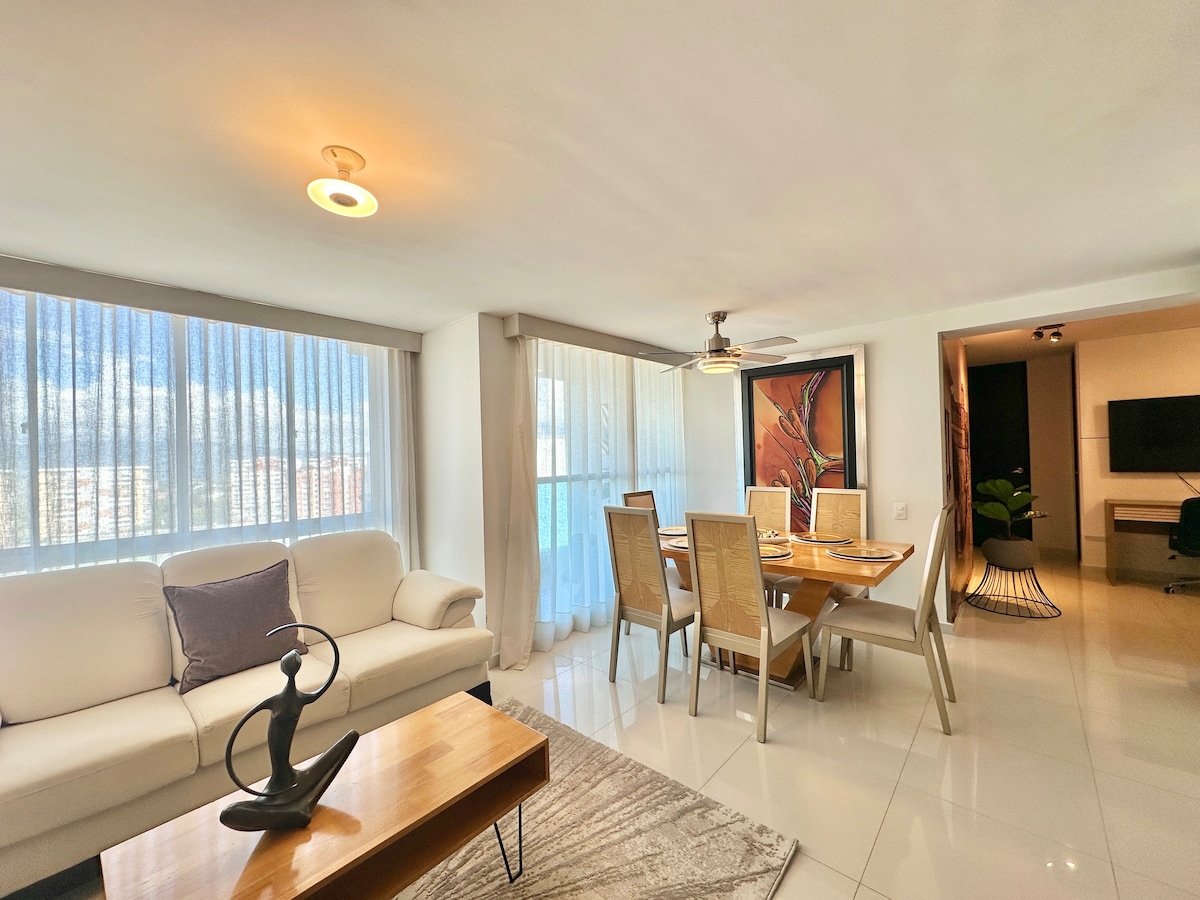Beautiful brand new apartment. 10th floor with amazing sunset view. Central location. Residential and safe area next to the Cacique Mall and Neomundo Convention Center, easy access to Carrera 33,Cabecera,Girón and Floridablanca. 2 bedrooms, 2 balconies, hammock, 2 bathrooms, 2 beds, an auxiliary bed and a sofa bed. Excellent lighting and ventilation, 300mbps WIFI, 2 TVs with access to DirecTvGO, Netflix, Amazon and HBO. Ground floor of the complex with minimarket, bakery, pharmacy, among others.