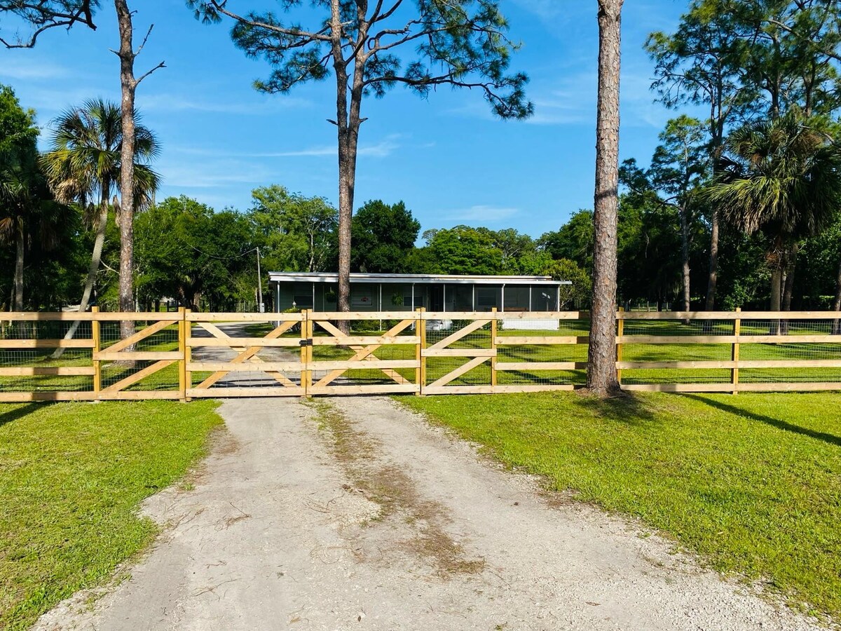 Witamy w naszym uroczym domku na farmie położonym w samym sercu południowo-zachodniej Florydy. Nasz przytulny dom oferuje spokojny wypoczynek w otoczeniu bujnej zieleni i delikatnego szumu natury. Wejdź do środka i odkryj jasną i zachęcającą przestrzeń ozdobioną wystrojem inspirowanym wybrzeżem i nowoczesnymi udogodnieniami. Znajduje się on w spokojnej okolicy Buckingham Farms w mieście Fort Myers. 40 minut od Bonita Beach i Fort Myers Beach. Kilka minut od supermarketów i centrów handlowych