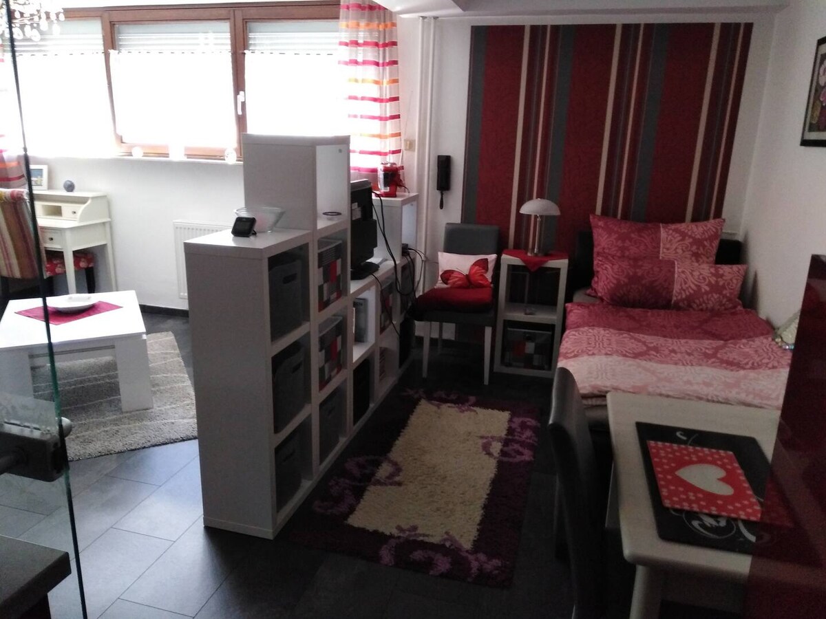 Witaj w Airbnb na obrzeżach Moguncji! Samodzielny apartament o powierzchni 21 m² w pobliżu pól, lasów i łąk jest idealny dla osób samotnych lub par. Jest tu otwarta przestrzeń wyposażona w łóżko dla dwóch osób, szafę i stół jadalny (bez kuchni); jest też łazienka, która oferuje wszystko, co jest potrzebne. Możesz tu pracować (Wi-Fi dostępne) lub spędzać wolny czas. Parking jest bezpłatny, a zameldowanie jest elastyczne po 16:00. Przyjemny pobyt ☺️