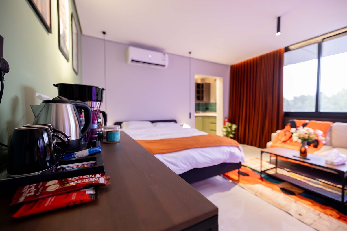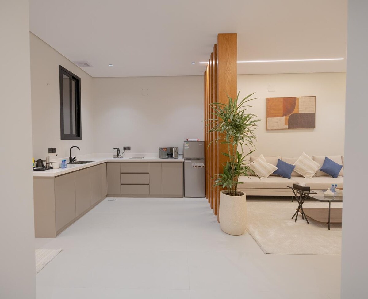 شقة بتصميم عصري مريح بدخول ذاتي تتكون من غرفة نوم وركن تحضيري ومنطقة مخصصة للقهوة وصالة ودورة مياه بيئة منزلية دافئة، توفر لك الراحة والخصوصية والعديد من المميزات التي تلبي جميع احتياجاتك