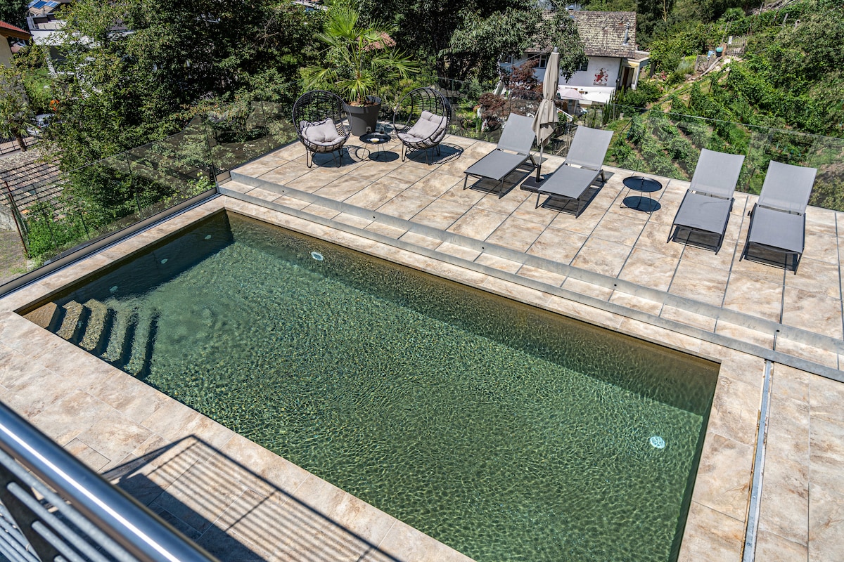Witamy w panoramicznym apartamencie "serce i widok" - raju z widokiem – w ekologicznym drewnianym domu. W górach w domu – w środku natury - ciche panoramiczne położenie z fantastycznymi widokami na Merano i okolicę – opalanie - piękne do zakochania - romantyczne – czarujące - wyjątkowe! Panoramiczny apartament "serce & Widok" jest 70 m2 otwartym poddaszu z ekskluzywnymi meblami i atmosferą dobrego samopoczucia. Do zobaczenia!