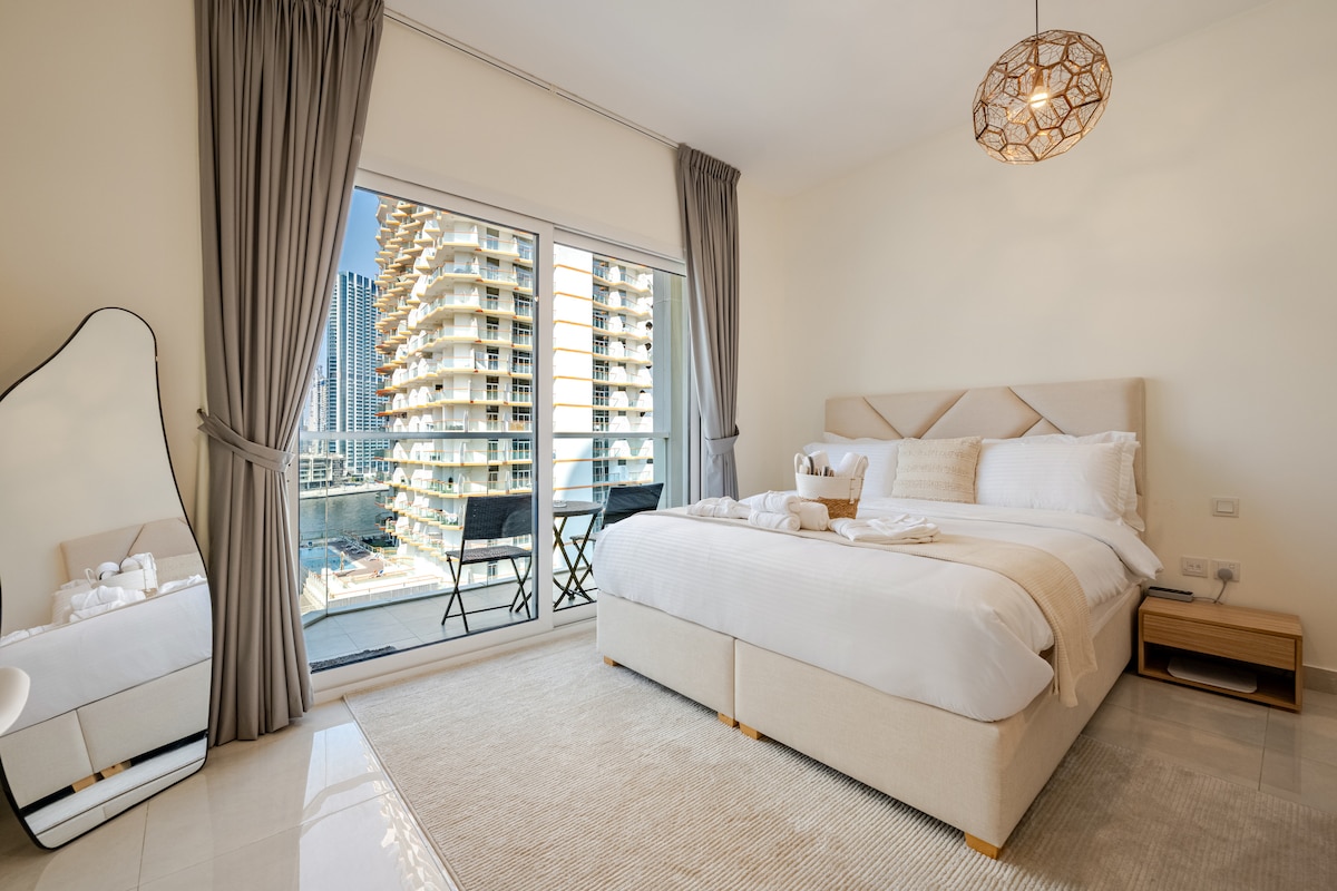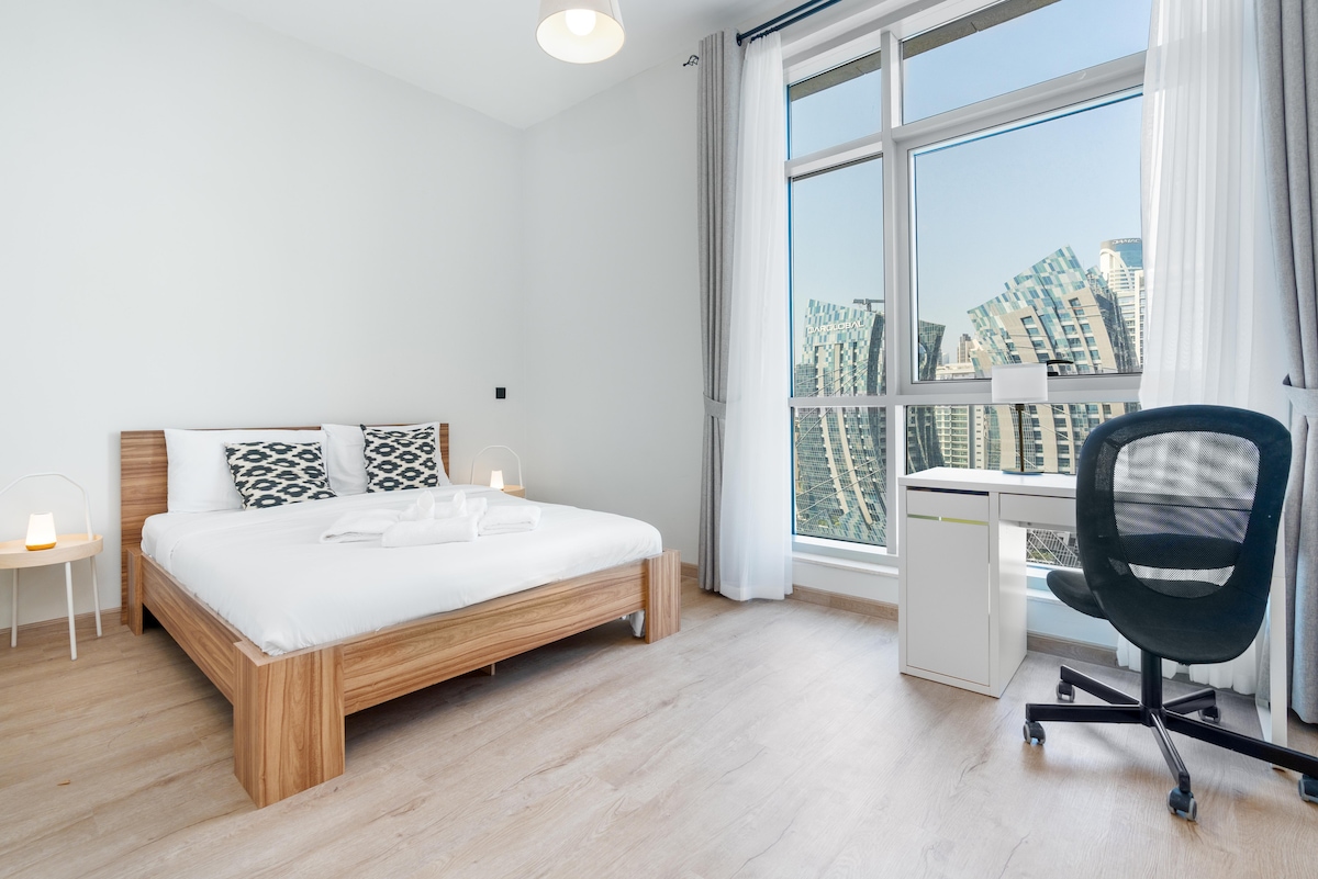 Obudź się w eleganckim apartamencie z jedną sypialnią, położonym w samym sercu miasta, i podziwiaj znany na całym świecie widok na Burdż Chalifa. Ciesz się komfortowym i luksusowym pobytem z najwyższej klasy udogodnieniami, nowoczesnym wystrojem w stylu boho i łatwym dostępem do najlepszych atrakcji. Wieczorem zrelaksuj się, podziwiając zachód słońca, hipnotyzujący pokaz świateł Burdż Chalifa i lśniącą panoramę miasta – wszystko to w Twoim miejscu na Airbnb. Zarezerwuj teraz i przeżyj niezapomniane chwile w Dubaju!