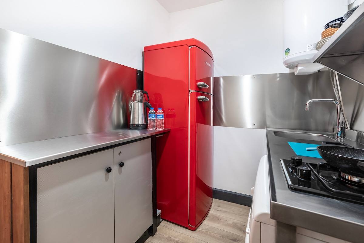 To prywatne luksusowe mieszkanie zostało niedawno odnowione. Ma wysoki sufit (3,6 metra), dość dużą łazienkę, sypialnię z łóżkiem typu king size, saunę, jacuzzi, projektor ścienny (stały!) i kominek. Jest bardzo odpowiedni dla krótko- lub długoterminowych pobytów, par i rodzin, a jego lokalizacja to pierwsze piętro naszego apartamentu na bezpiecznej ulicy w Beyoglu/Taksim. Można do niego dotrzeć windą lub schodami. Nasz budynek znajduje się obok ulicy Istiklal i 10 minut spacerem od słynnego portu Galata. Internet to 100 MBPS solidnego światłowodu!
