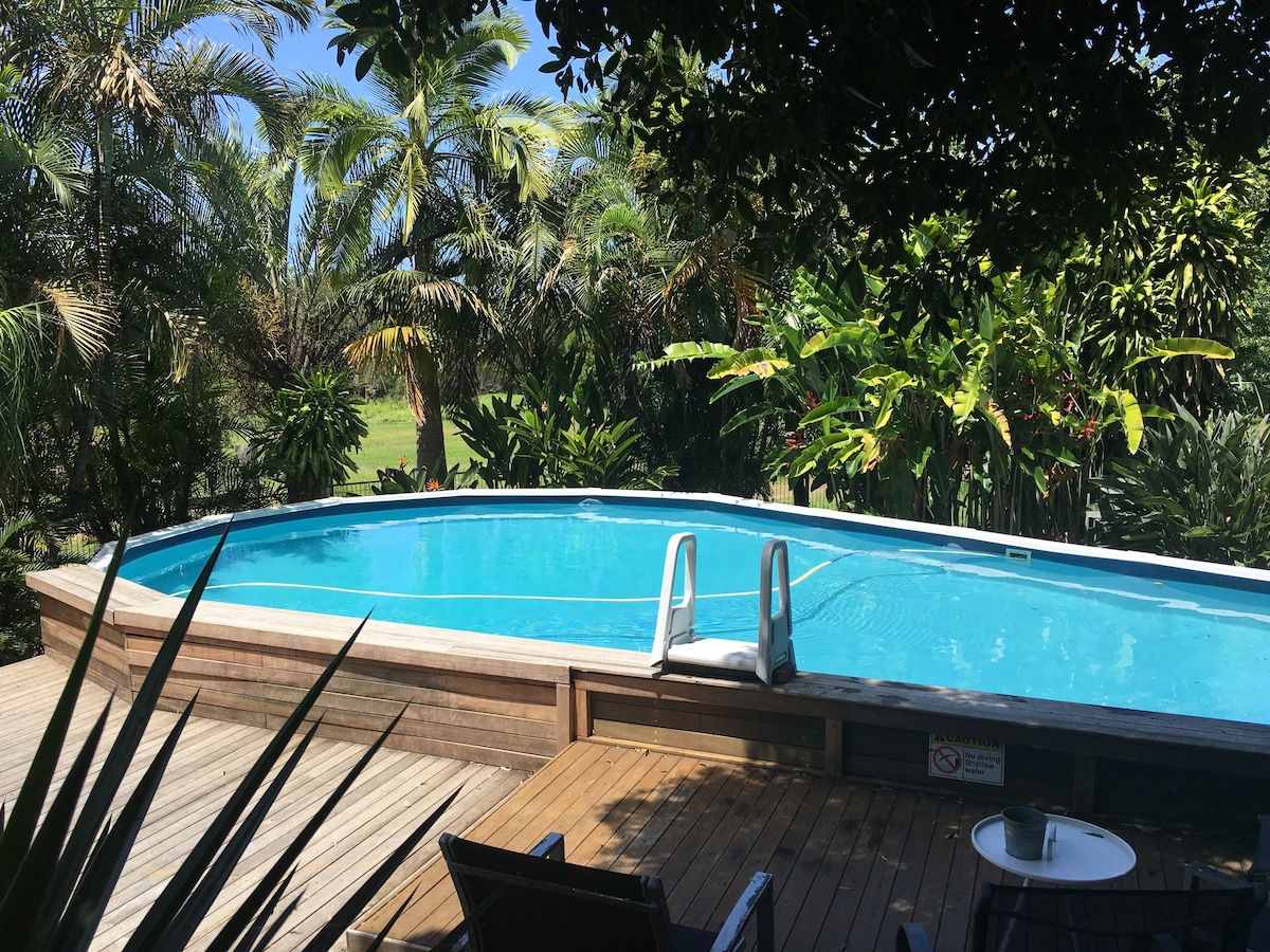 Piękny przestronny, ultranowoczesny domek położony na 5 akrach egzotycznych tropikalnych ogrodów botanicznych z naturalnymi lasami deszczowymi i potokiem, gdzie możesz po prostu zapomnieć o sobie i po prostu być. Oszałamiająca, w pełni ogrodzona przestrzeń prywatna dla maksymalnie 4 osób, aby się zrelaksować i cieszyć spokojem otaczającego balijskiego ogrodu wodnego i własnego prywatnego basenu do nurkowania oraz 5-osobowej wanny z hydromasażem w pięknej altance. Całkowicie spokojna przestrzeń, ale tylko 15 minut do Mullumbimby, Brunswick Heads i plaż oceanicznych
