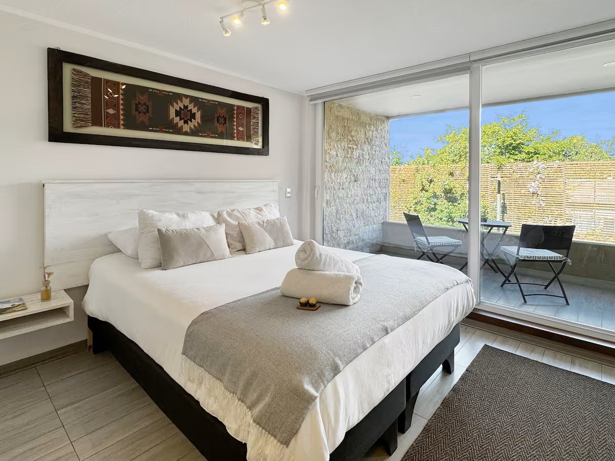 Nowe i przytulne studio w najlepszej lokalizacji w Pucón, kilka kroków od dużej plaży, centrum i odizolowane od hałasu głównej ulicy. Oferuje między innymi podwójne łóżko, podwójny futon, w pełni wyposażoną kuchnię, łazienkę, Wi-Fi, telewizor 49" z Netflix, Disney+ i nie tylko, taras, ogrzewanie, grill, ekspresy do kawy, 2 rowery do nieograniczonego użytku. Dostępny jest publiczny parking przed wejściem do budynku. Obejmuje pościel, ręczniki oraz podstawowe przybory łazienkowe i kuchenne na każdy pobyt.
