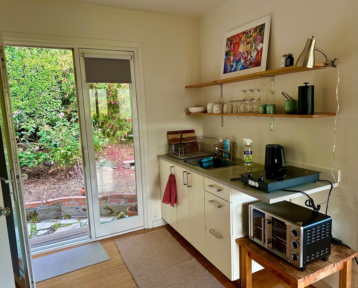 PRYWATNE MINI-STUDIO Z: • PRYWATNE wejście • PRYWATNY BEZPŁATNY parking na zewnątrz • PRYWATNY taras (PALENIE DOZWOLONE tylko na zewnątrz na tarasie) • PRYWATNY aneks kuchenny • PRYWATNA łazienka • Łóżko typu Queen i pojedyncza sofa – poinformuj nas Z WYPRZEDZENIEM, jeśli będziesz potrzebować SOFY podczas pobytu • Mała lodówka i telewizor z płaskim ekranem i HBO • Miejsca do spania dla maksymalnie dwóch osób dorosłych. Najlepiej nadaje się dla jednej osoby, pary lub dwóch bliskich przyjaciół. (NIE jesteśmy zatwierdzeni dla więcej niż dwóch gości.)