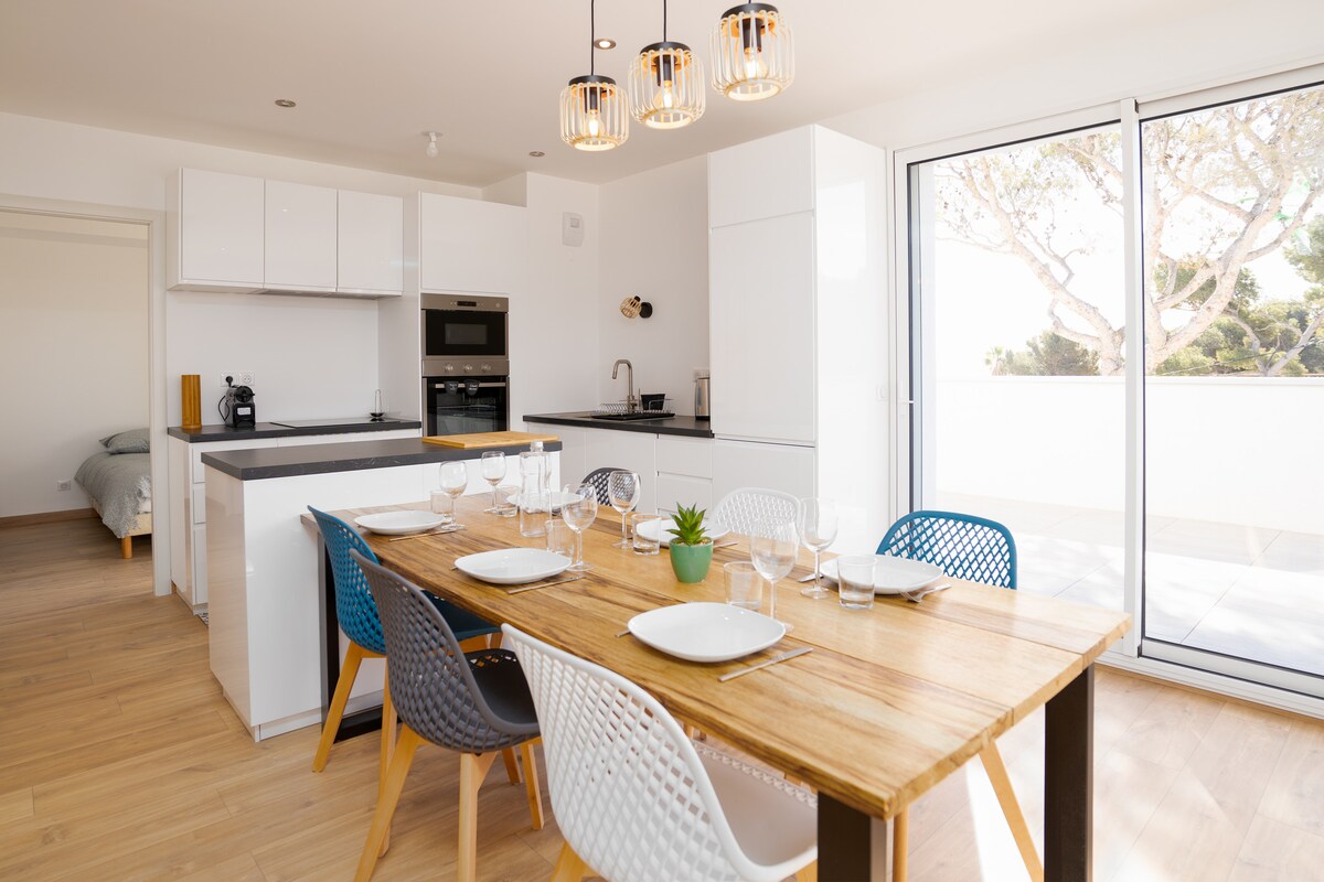 Escape to the breathtaking Blue Coast and experience Provence in a studio thoughtfully designed by architect owners. Wake up to stunning hill & sea views from your private terrace and enjoy all the modern comforts. Walk to the sandy beach and explore the coves with a complimentary sea kayak. Conveniently located 10 minutes from the local train station and 25 minutes from Marseille airport with free parking. An unforgettable adventure awaits on the Blue Coast of Provence!