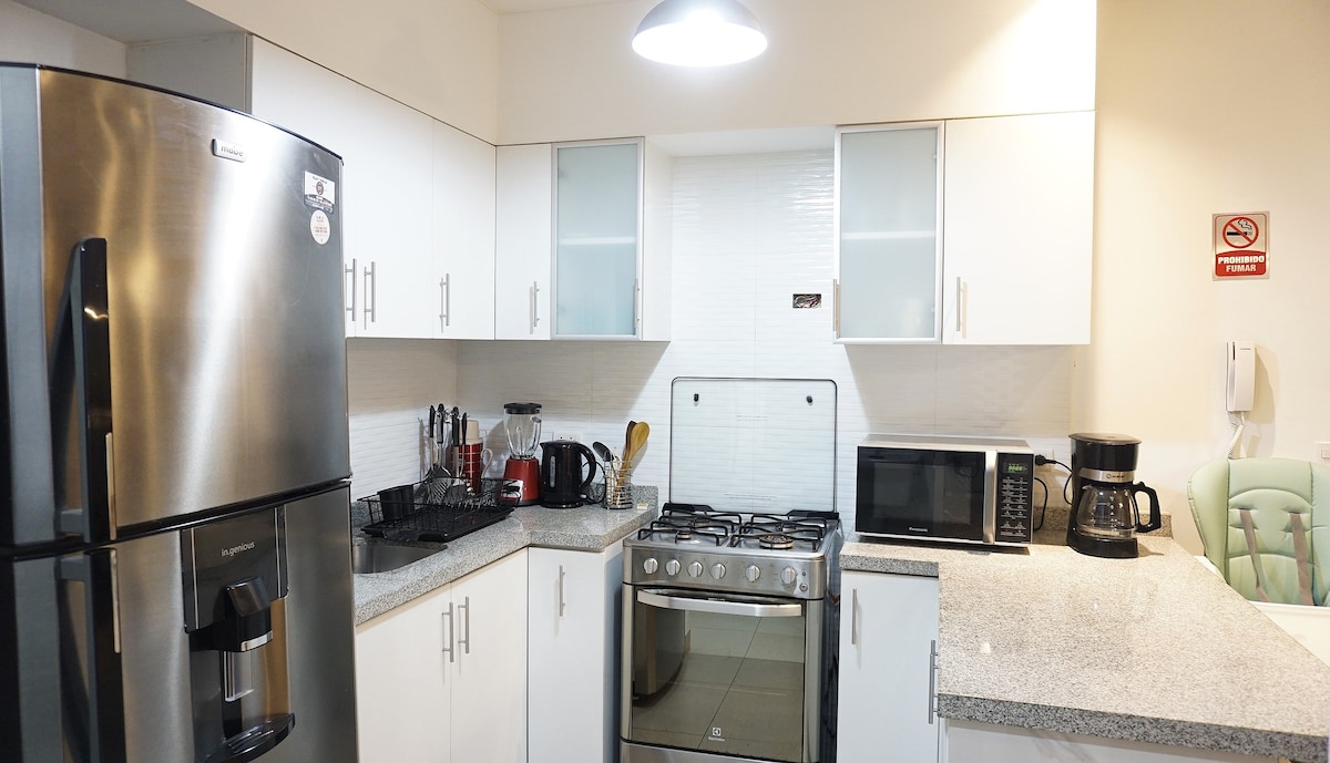 Si deseas sentirte como en casa y disfrutar de estancias agradables en un lugar ubicado a 15 minutos del aeropuerto. Mi Dpto. es espacioso, privado, con todas las comodidades y de uso exclusivo para una o dos personas. Cuenta con sala, comedor, cocina, lavandería, una habitación con cama dos plazas, y dos baños. La cocina está completamente equipada y existe un minibar. Cuento con Wi-fi y Netflix ideal para tus momentos de descanso. Además a 5 minutos hay un centro comercial.