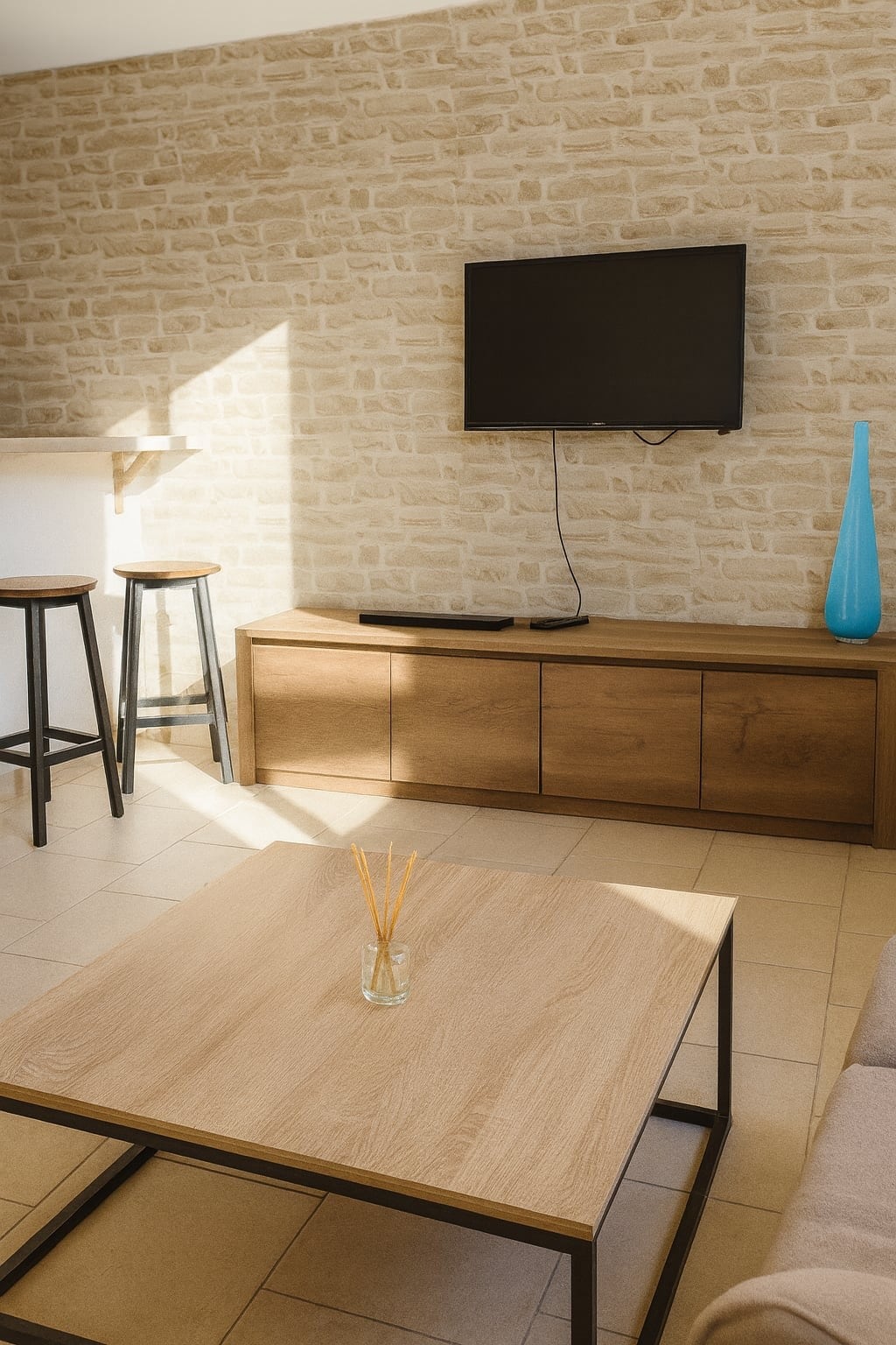 Niezależny loft o powierzchni 100 m2 otwiera się na dużą przestrzeń mieszkalną składającą się z salonu, otwartej kuchni i łazienki na parterze oraz antresoli na piętrze. W salonie znajduje się duża skórzana sofa, fotel i telewizor z płaskim ekranem. Otwarta kuchnia jest w pełni wyposażona, z wyspą centralną. W łazience znajduje się kabina prysznicowa typu walk-in, podwójna umywalka, pralka i toaleta. Obie sypialnie wyposażone są w łóżko o szerokości 160 cm i szafę.